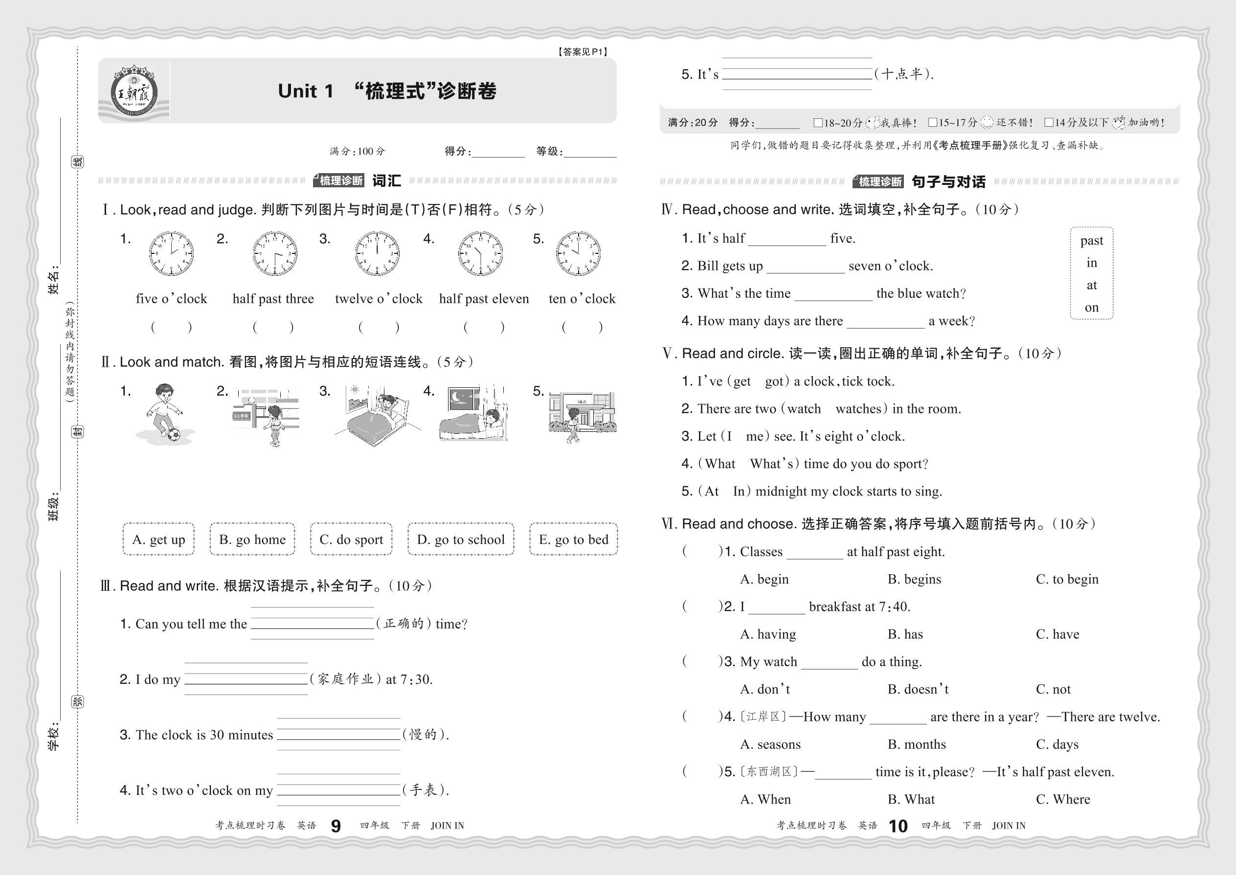 2024春下册四年级英语剑桥版 Unit 1 “梳理式”诊断卷