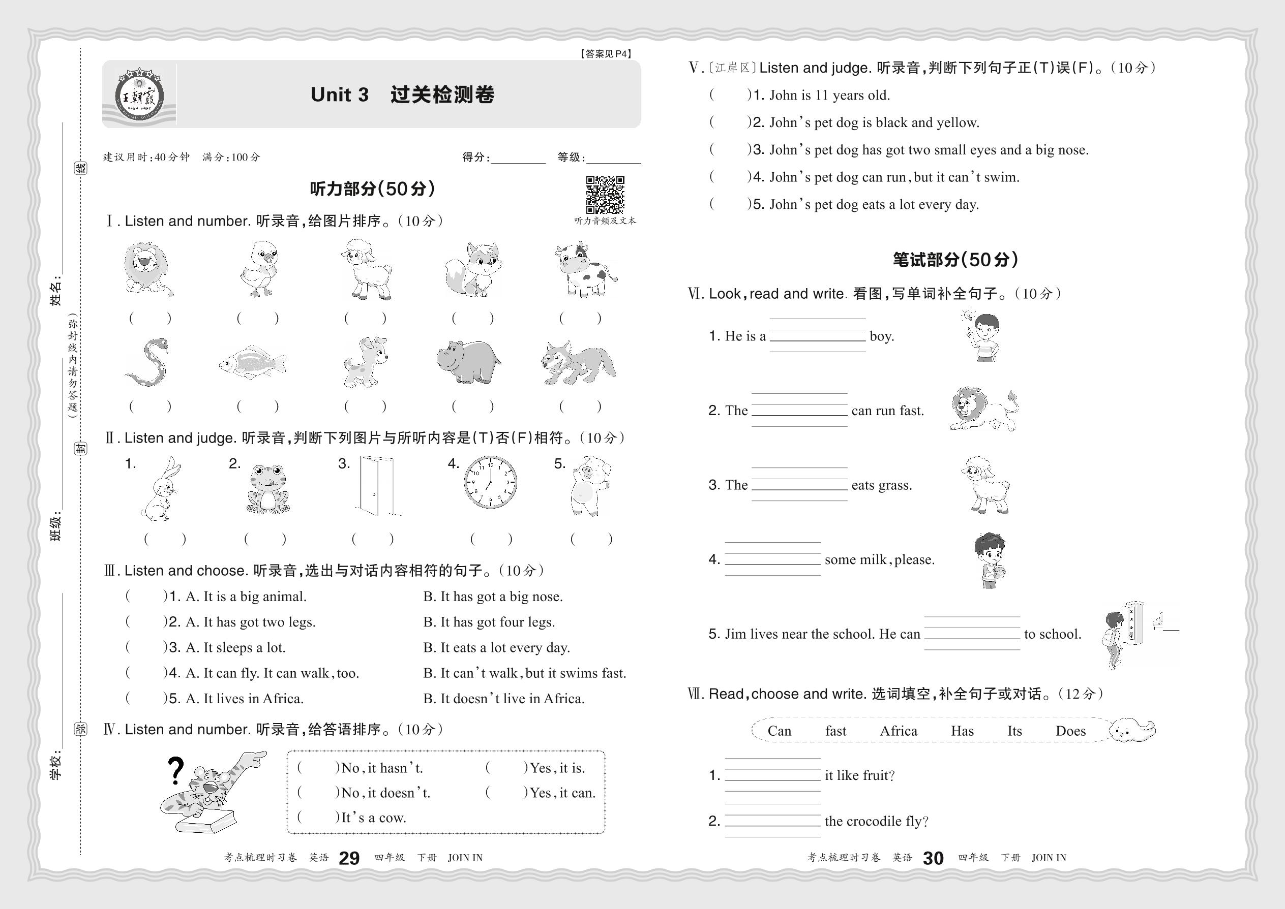 2024春下册四年级英语剑桥版 Unit 3 过关检测卷
