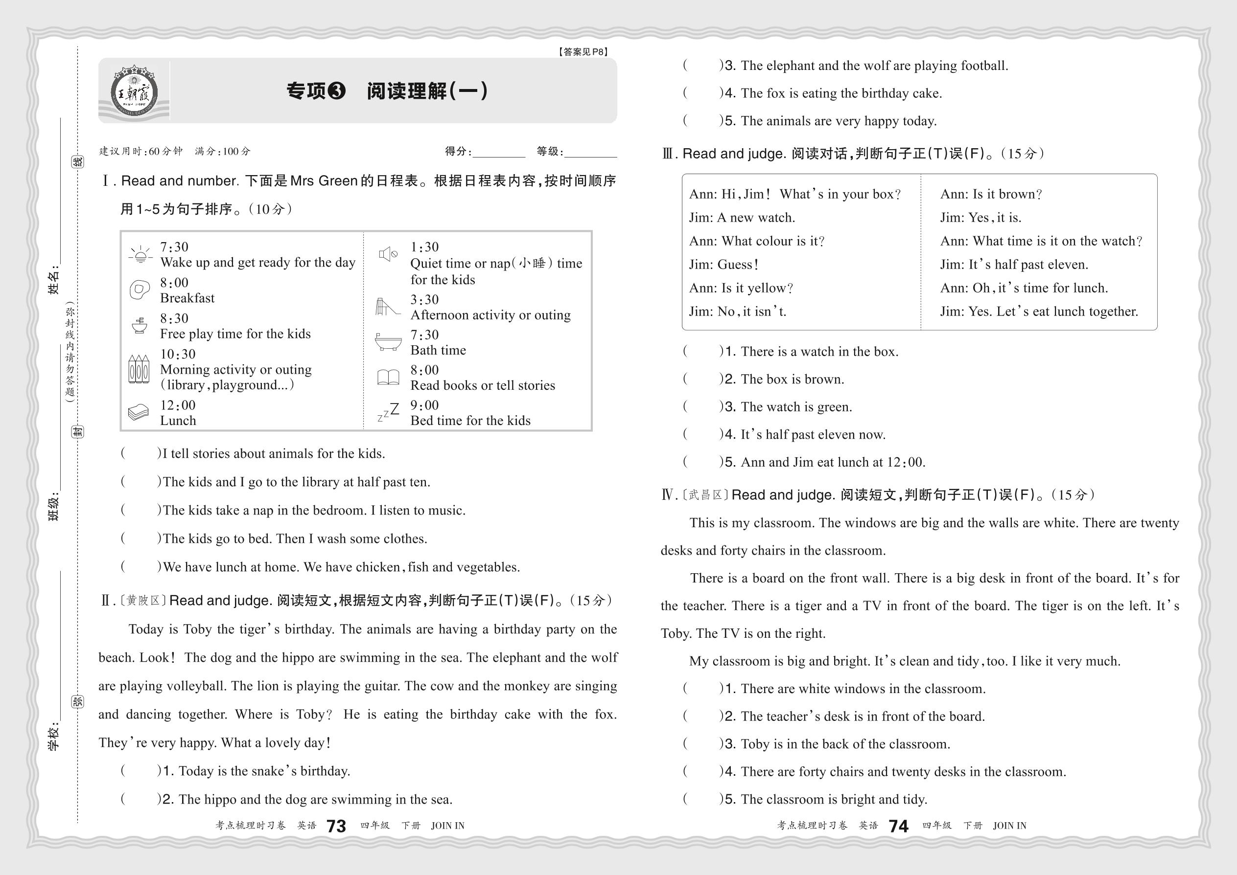 2024春下册四年级英语剑桥版 期末专项卷KD版·阅读理解(一)【3】