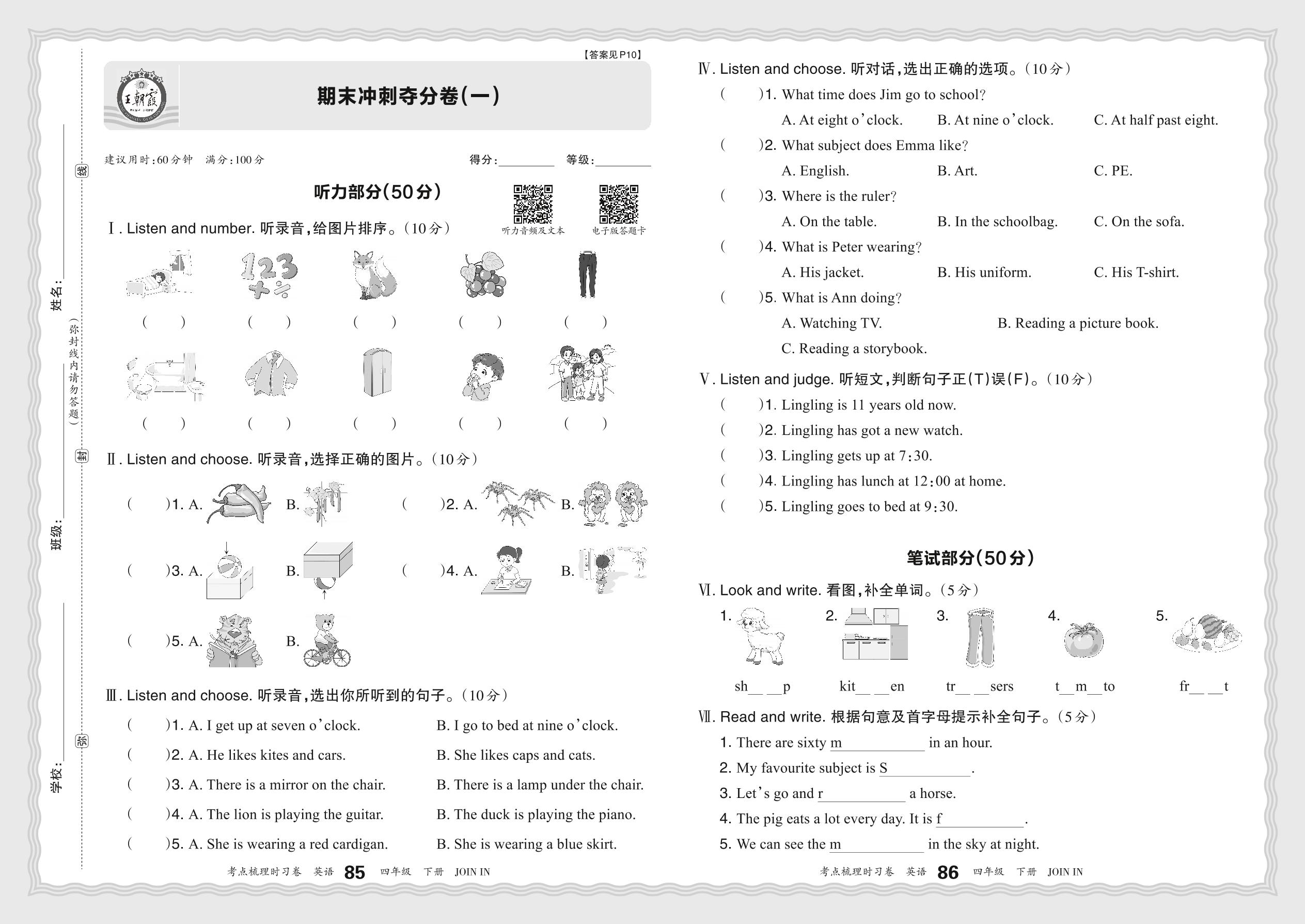 2024春下册四年级英语剑桥版 期末冲刺夺分卷(一)