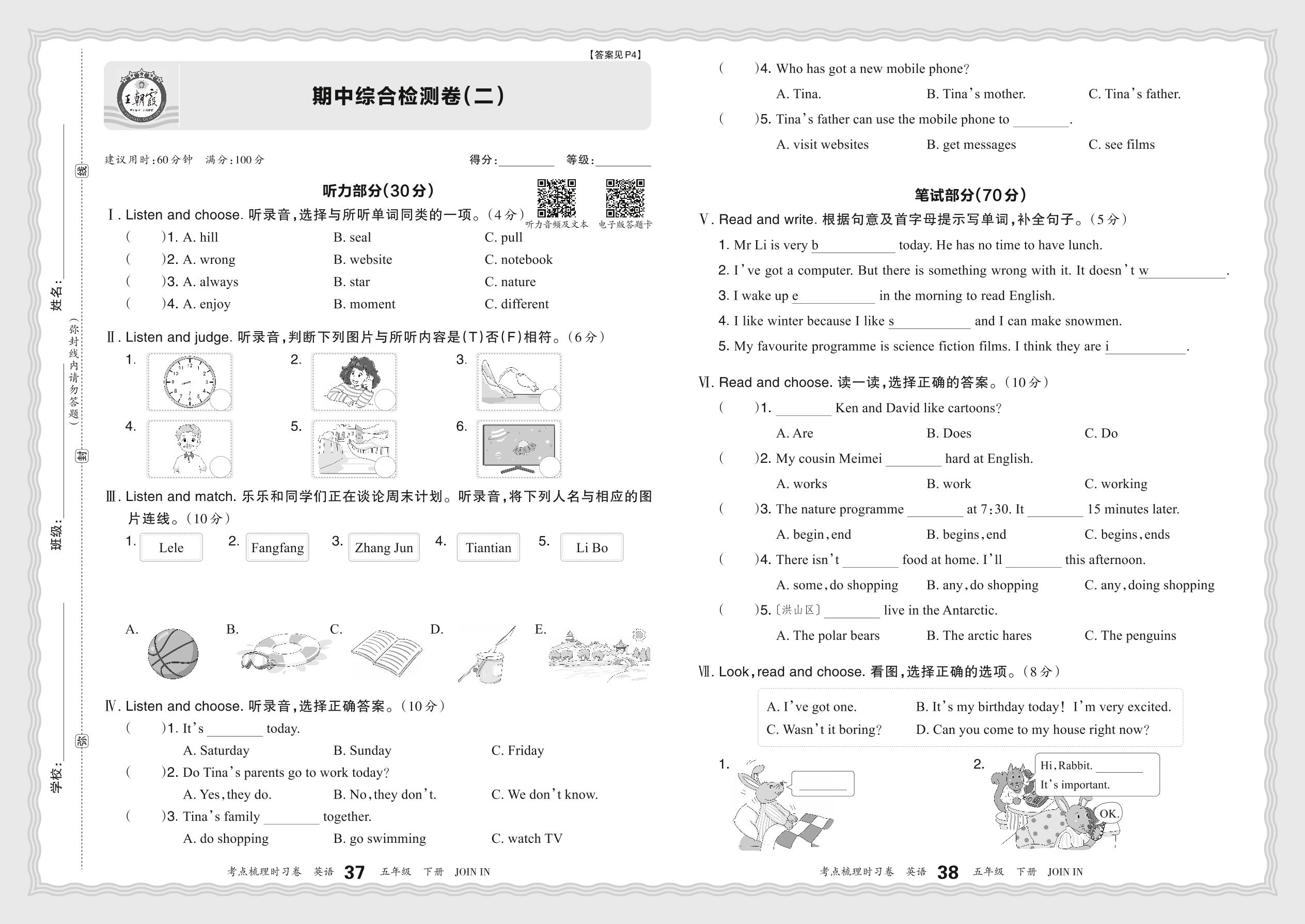 2024春下册五年级英语剑桥版 期中综合检测卷(二)