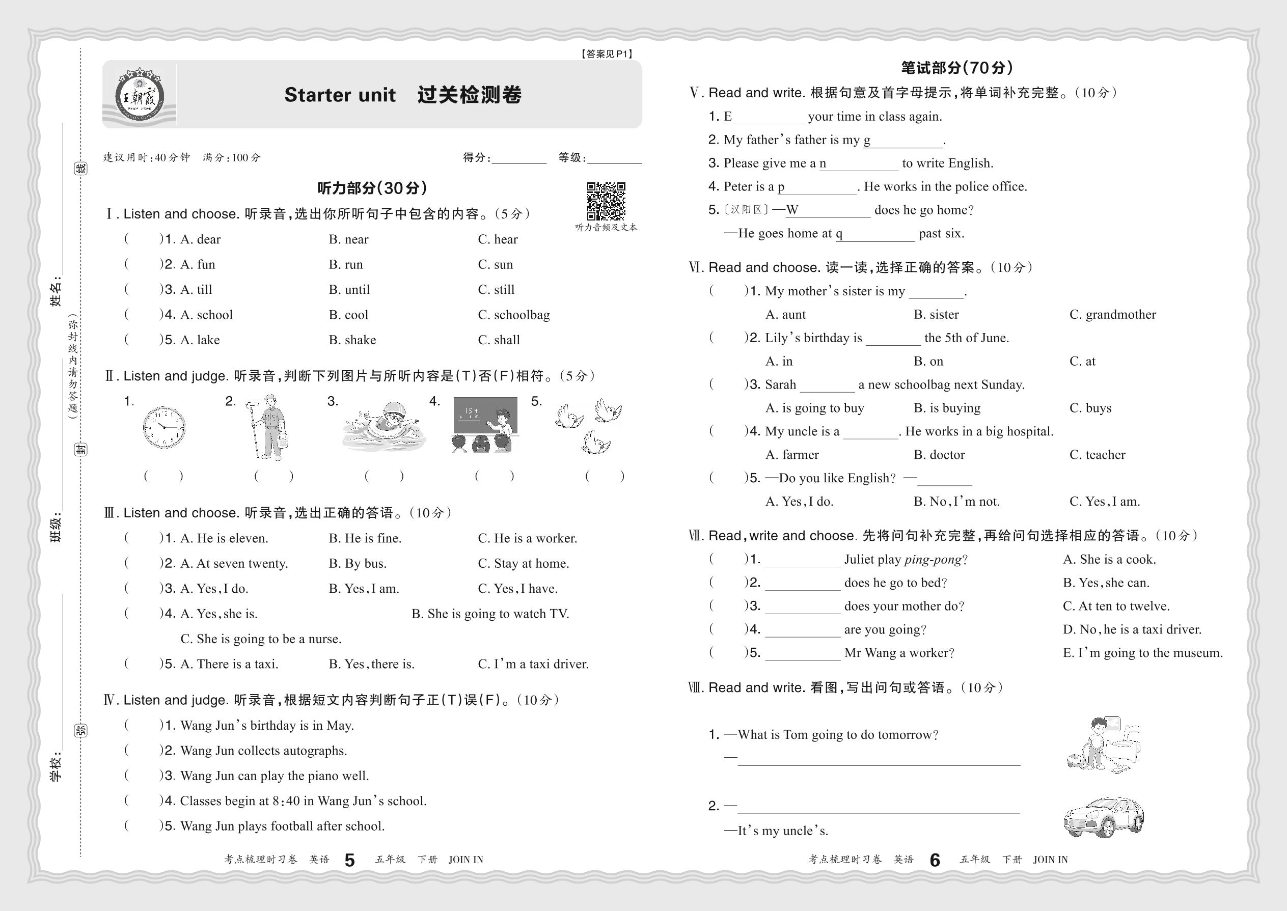 2024春下册五年级英语剑桥版 Starter unit 过关检测卷