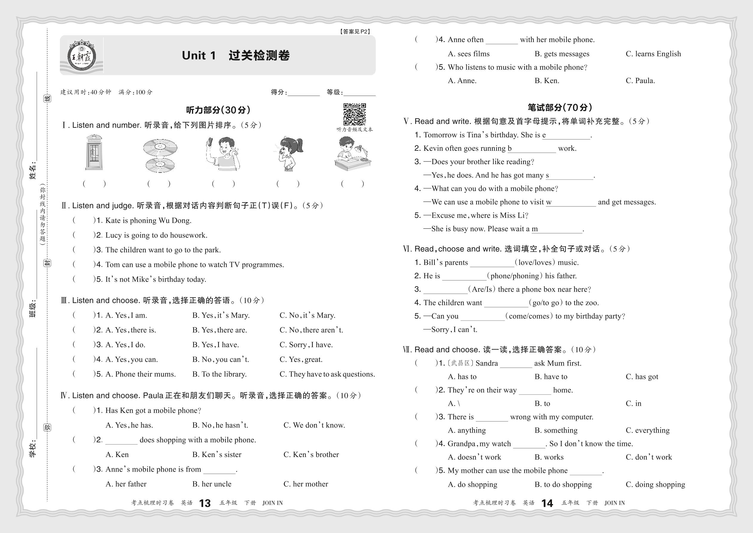 2024春下册五年级英语剑桥版 Unit 1 过关检测卷