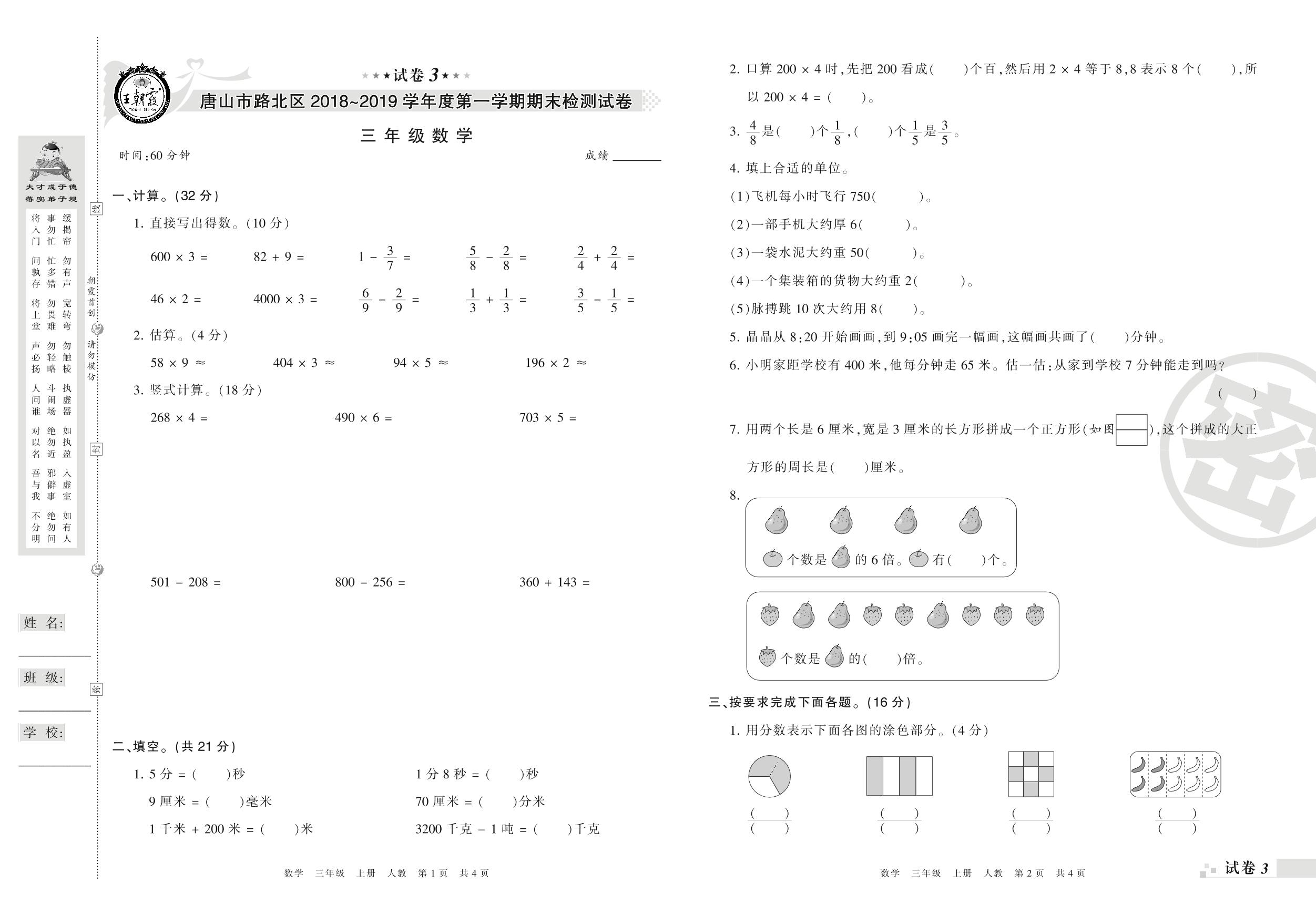 2018-2019学年第一学期唐山市路北区三年级数学试卷(人教版)【3】