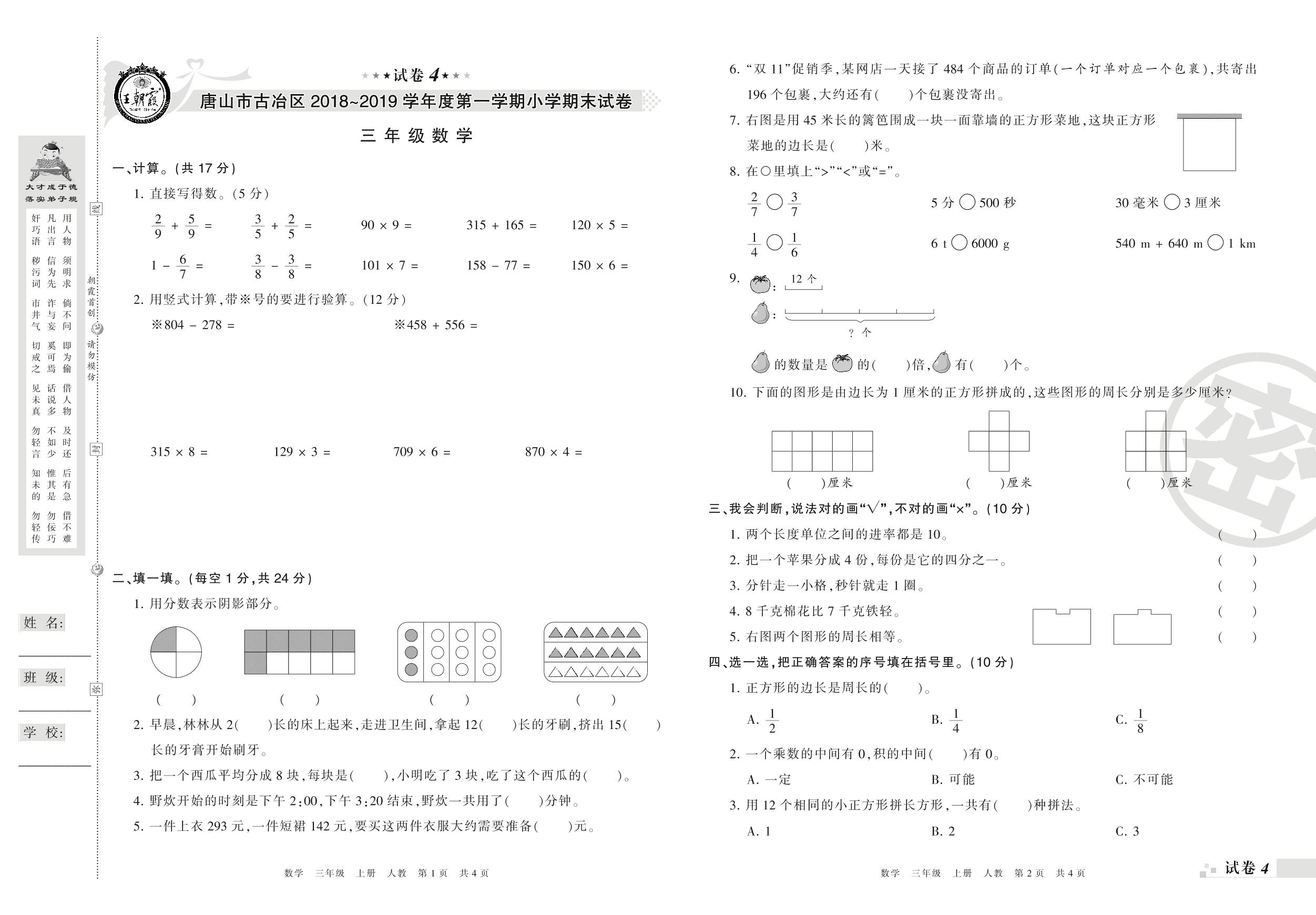 2018-2019学年第一学期唐山市古冶区三年级数学试卷(人教版)【4】