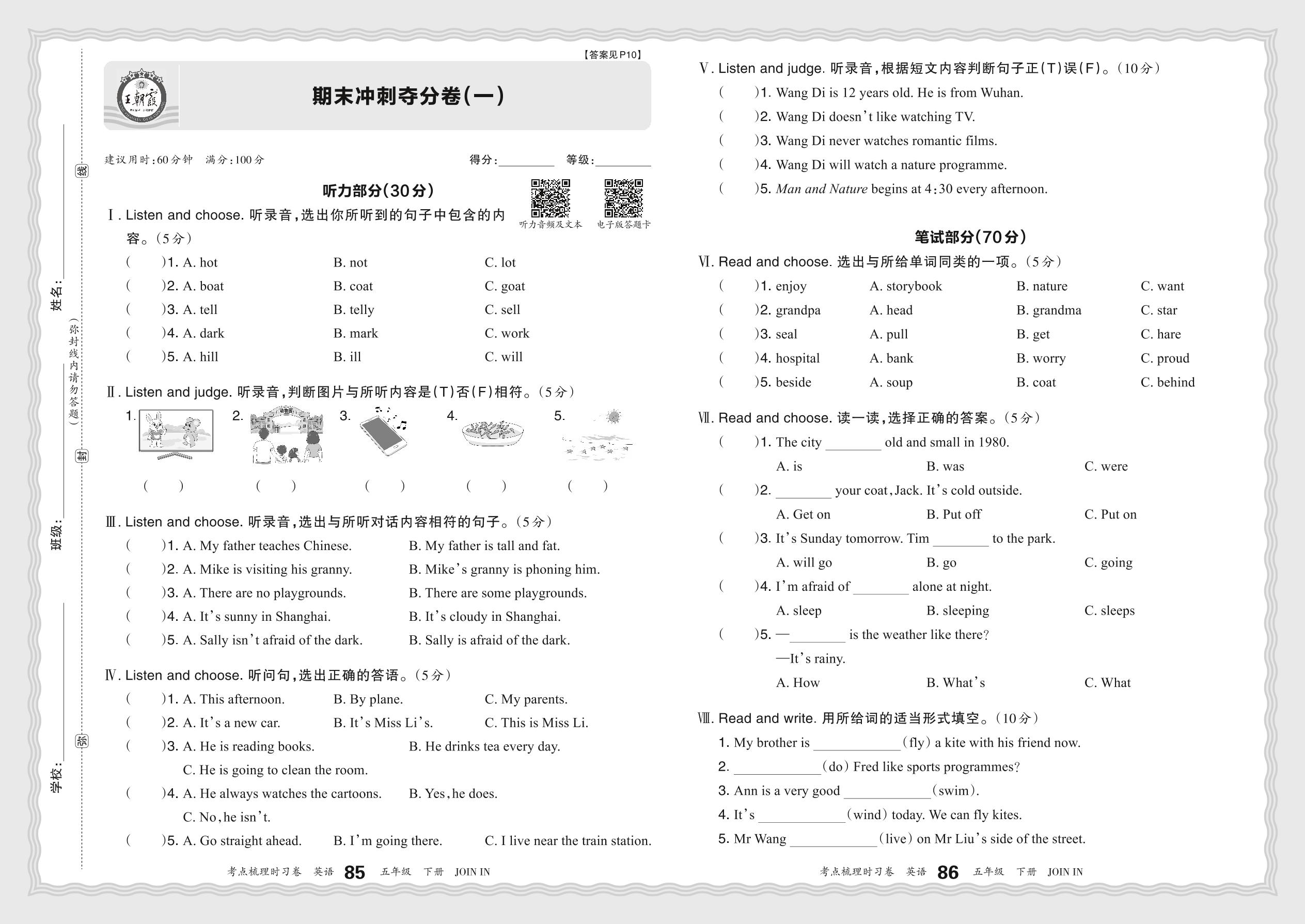 2024春下册五年级英语剑桥版 期末冲刺夺分卷(一)