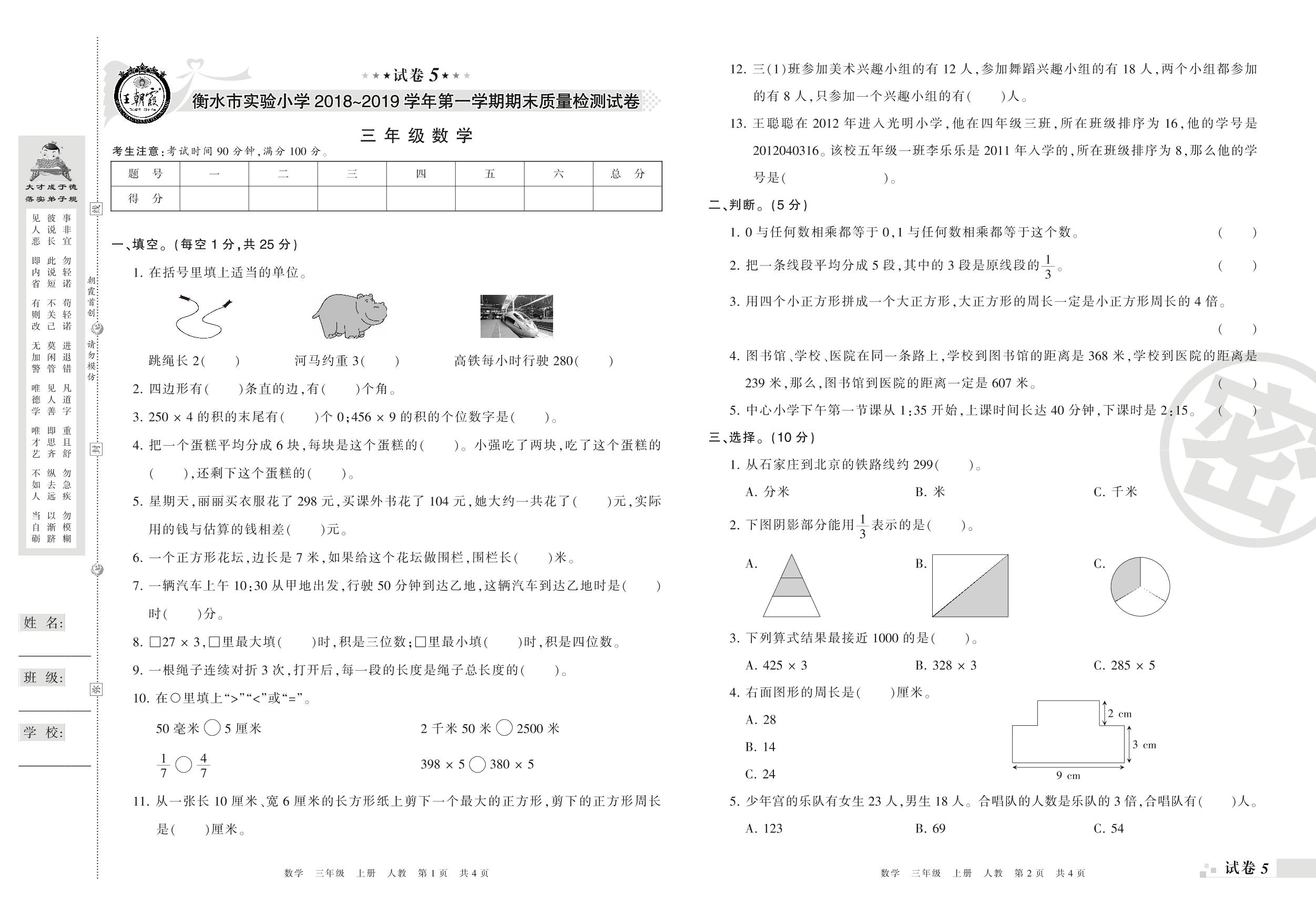 2018-2019学年第一学期衡水市实验小学三年级数学试卷(人教版)【5】