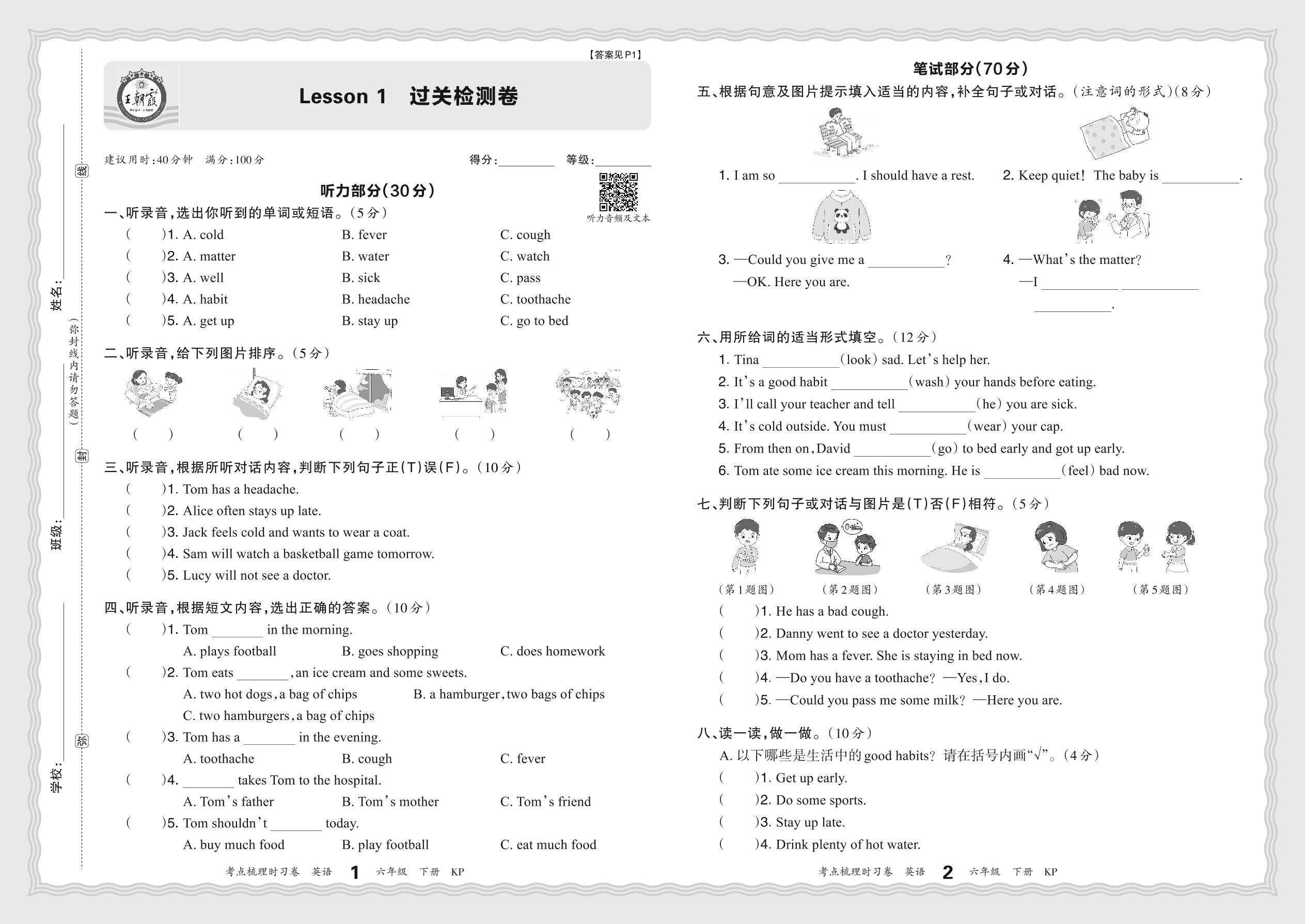 2024春下册六年级英语科普版 Lesson 1 过关检测卷