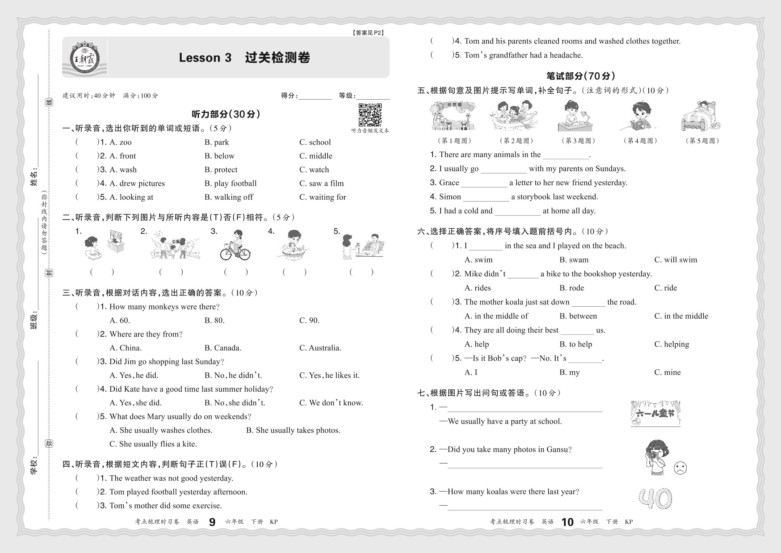 2024春下册六年级英语科普版 Lesson 3 过关检测卷