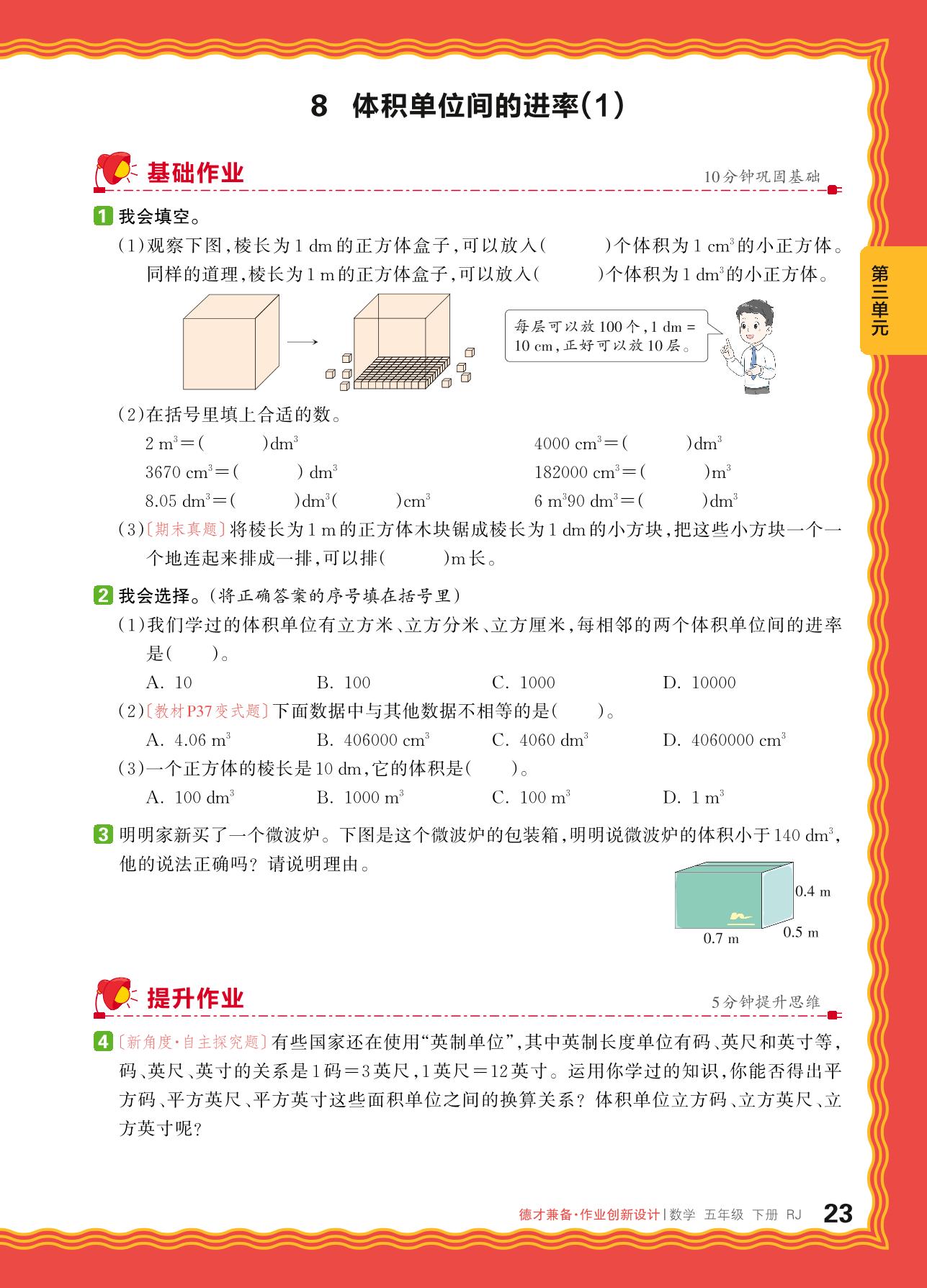 2024春下册五年级数学人教版 第三单元 长方体和正方体——8. 体积单位间的进率(1)