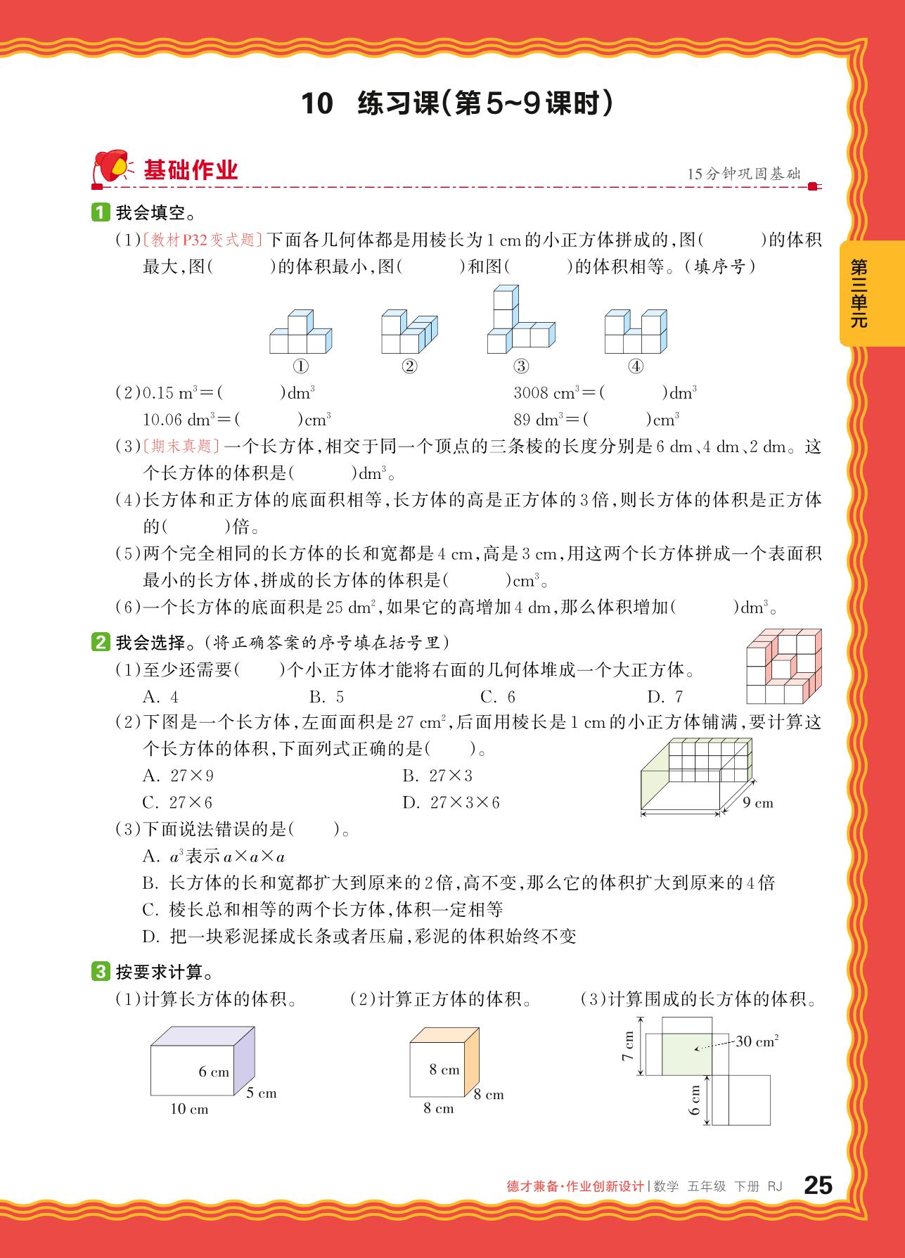 2024春下册五年级数学人教版 第三单元 长方体和正方体——体积和体积单位、长方体和正方体的体积、体积单位间的进率练习课_R