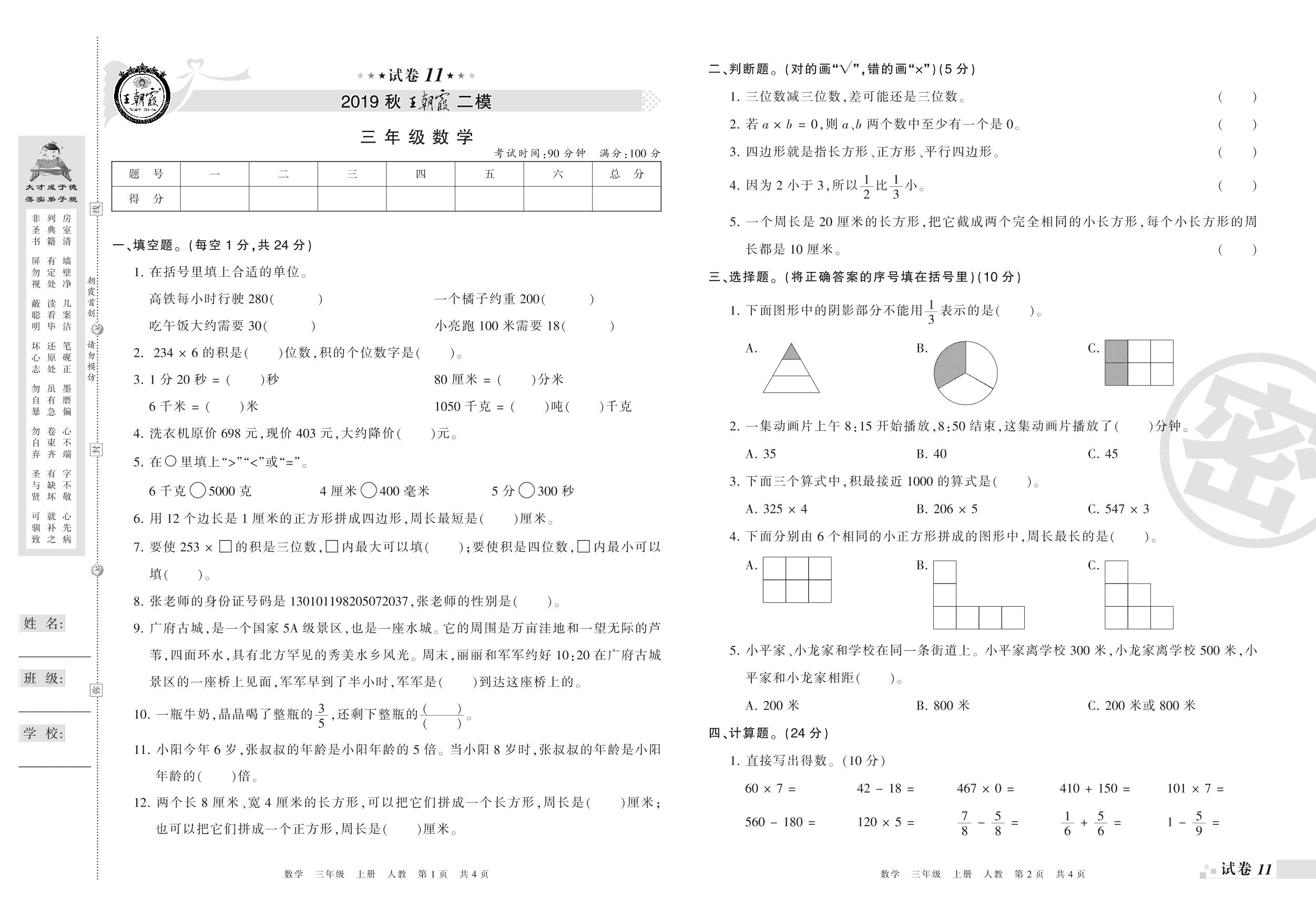 王朝霞期末模拟卷三年级上册数学(人教版)_R210804100106【11】