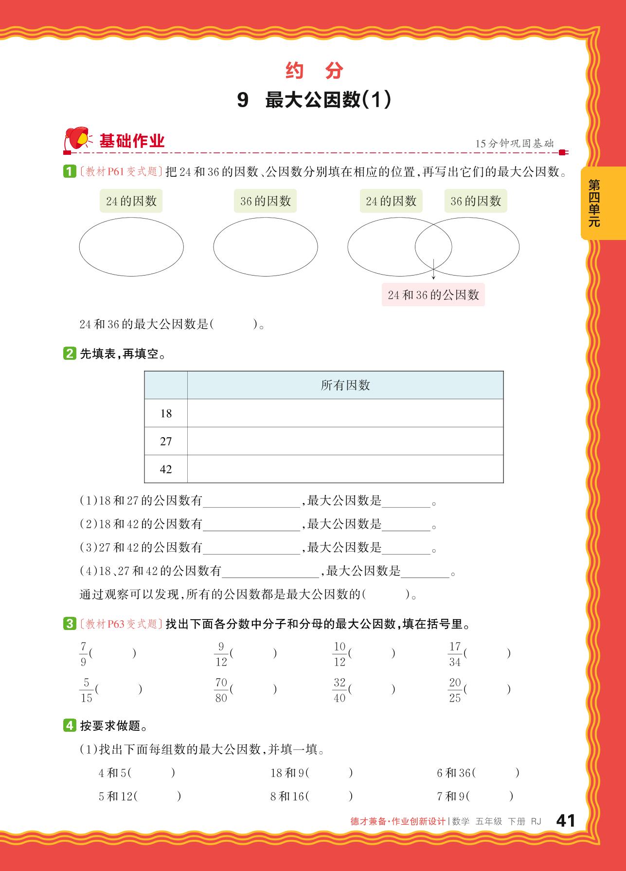 2024春下册五年级数学人教版 第四单元 分数的意义和性质——9. 最大公因数(1)