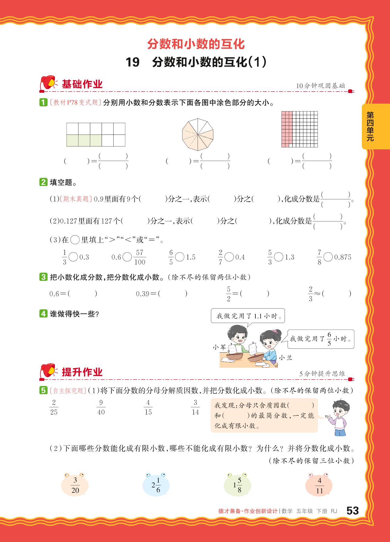 2024春下册五年级数学人教版 第四单元 分数的意义和性质——19. 分数和小数的互化(1)