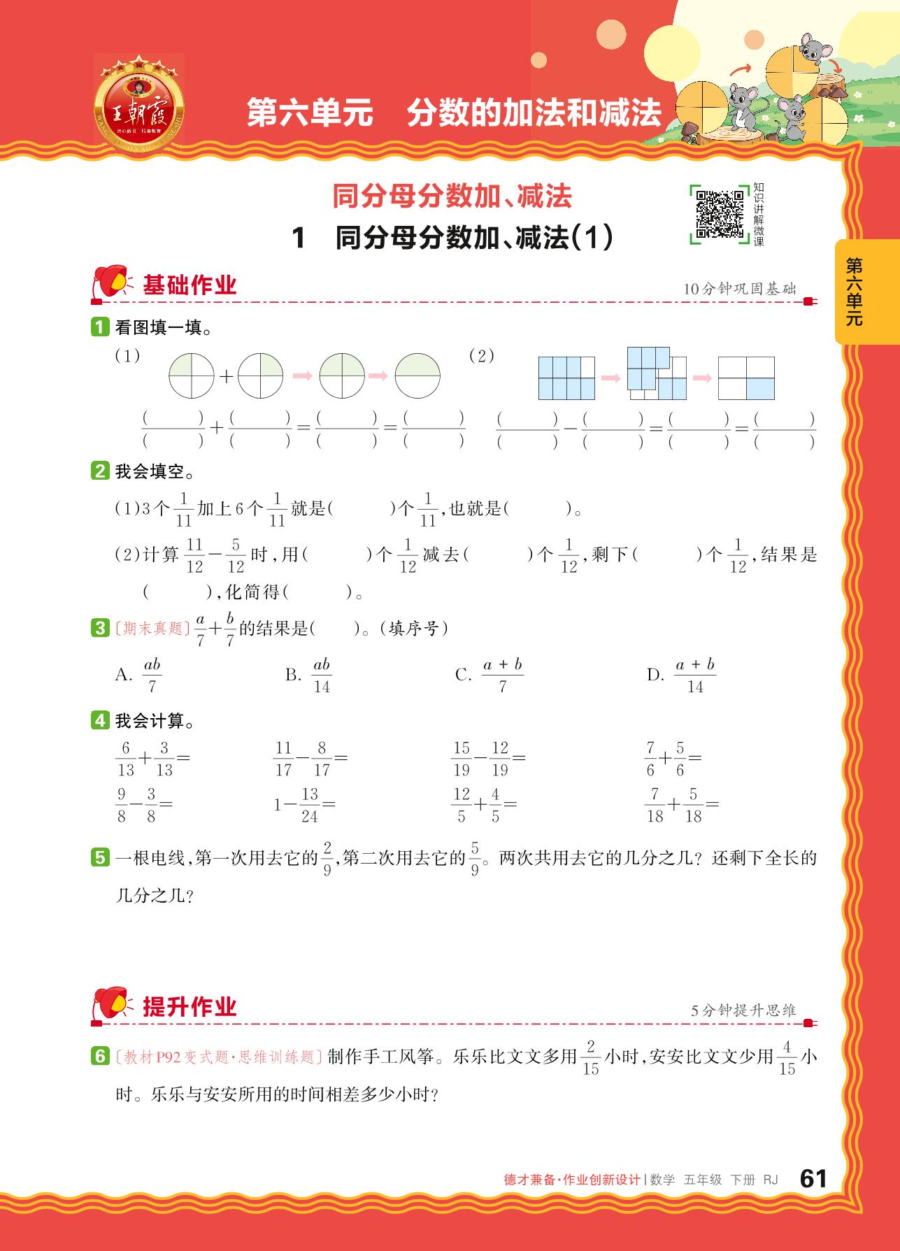 2024春下册五年级数学人教版 第六单元 分数的加法和减法——1. 同分母分数加、减法(1)