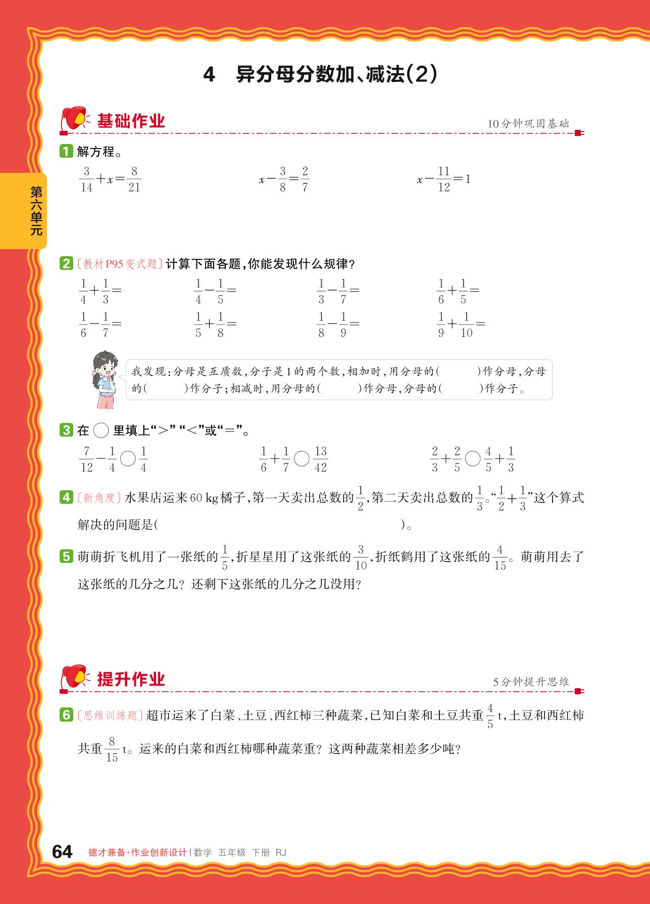 2024春下册五年级数学人教版 第六单元 分数的加法和减法——4. 异分母分数加、减法(2)