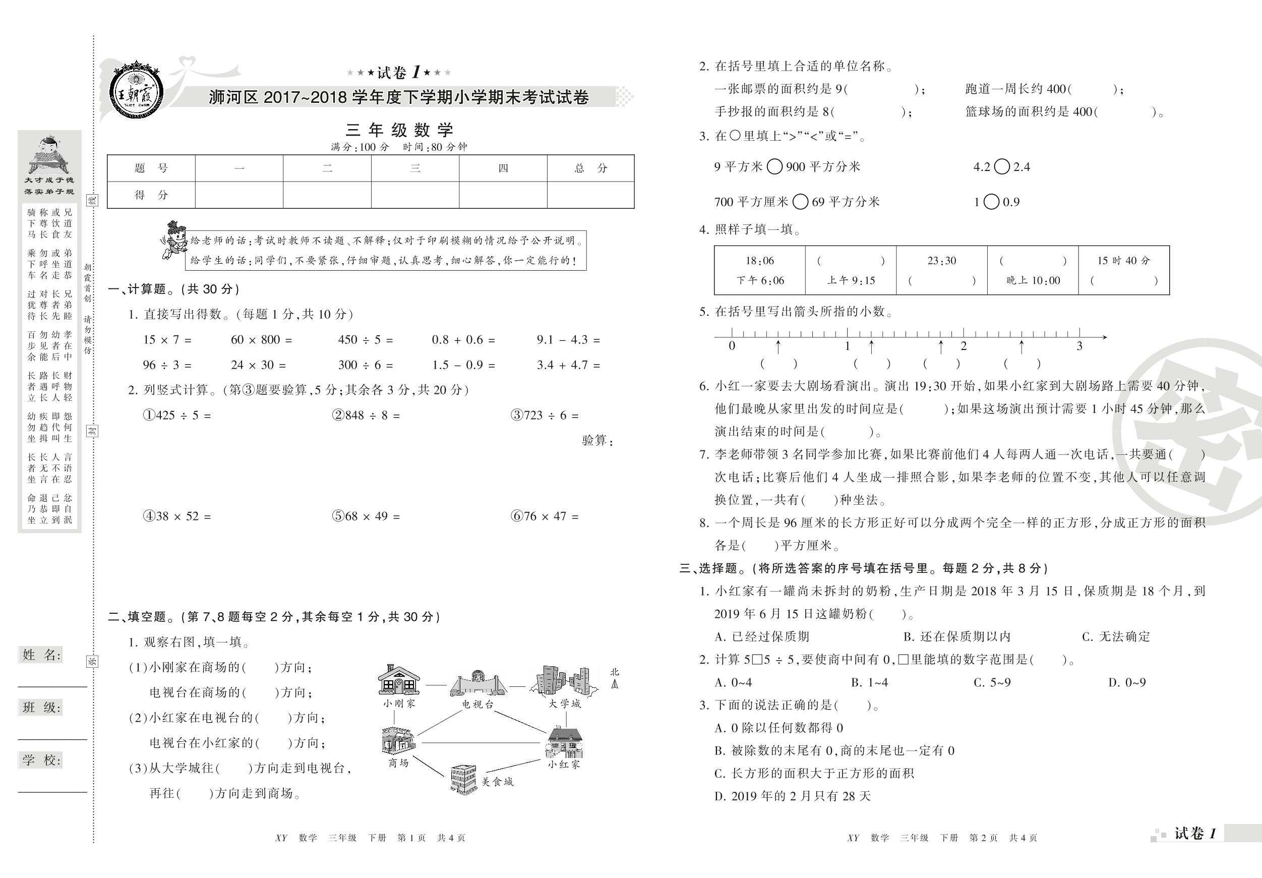 2017-2018学年第二学期信阳市浉河区三年级数学试卷(人教版)【1】