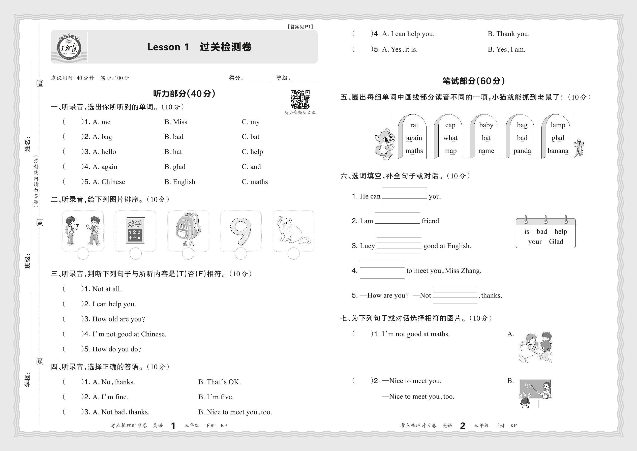 2024春下册三年级英语科普版 Lesson 1 过关检测卷