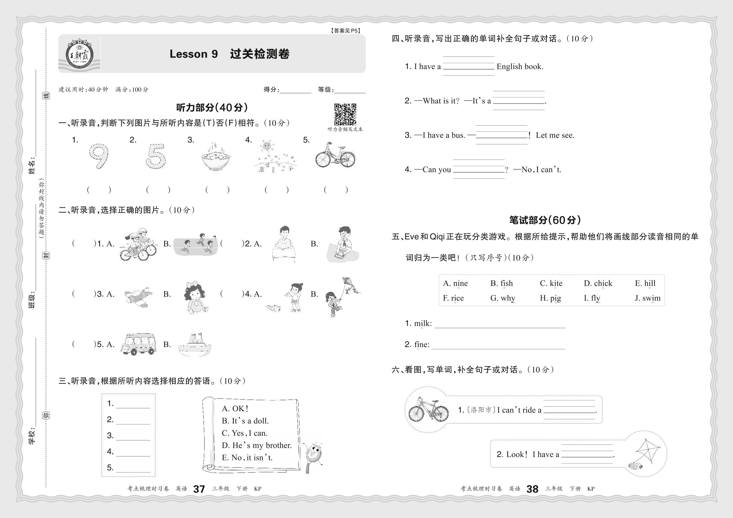 2024春下册三年级英语科普版 Lesson 9 过关检测卷