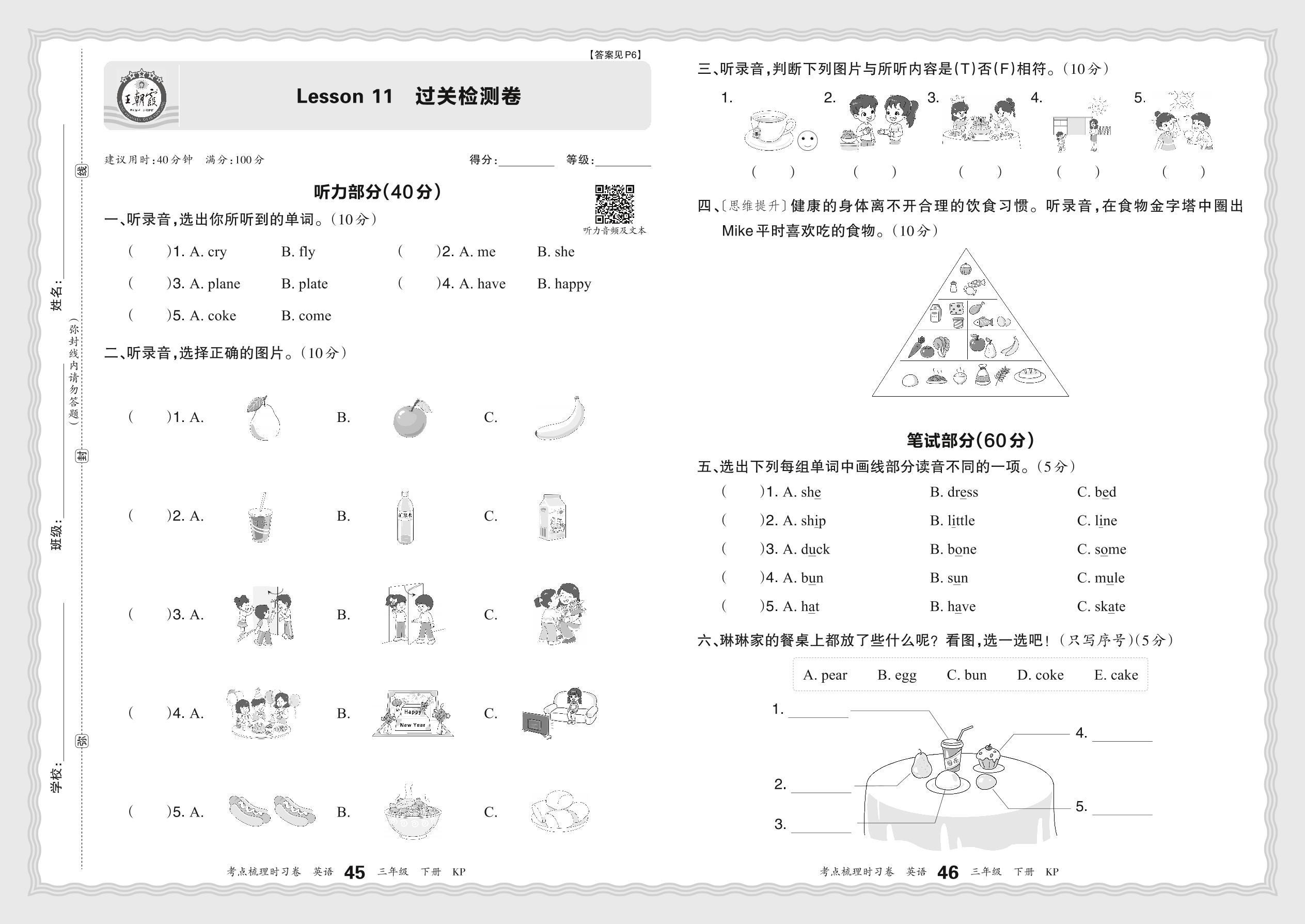 2024春下册三年级英语科普版 Lesson 11 过关检测卷
