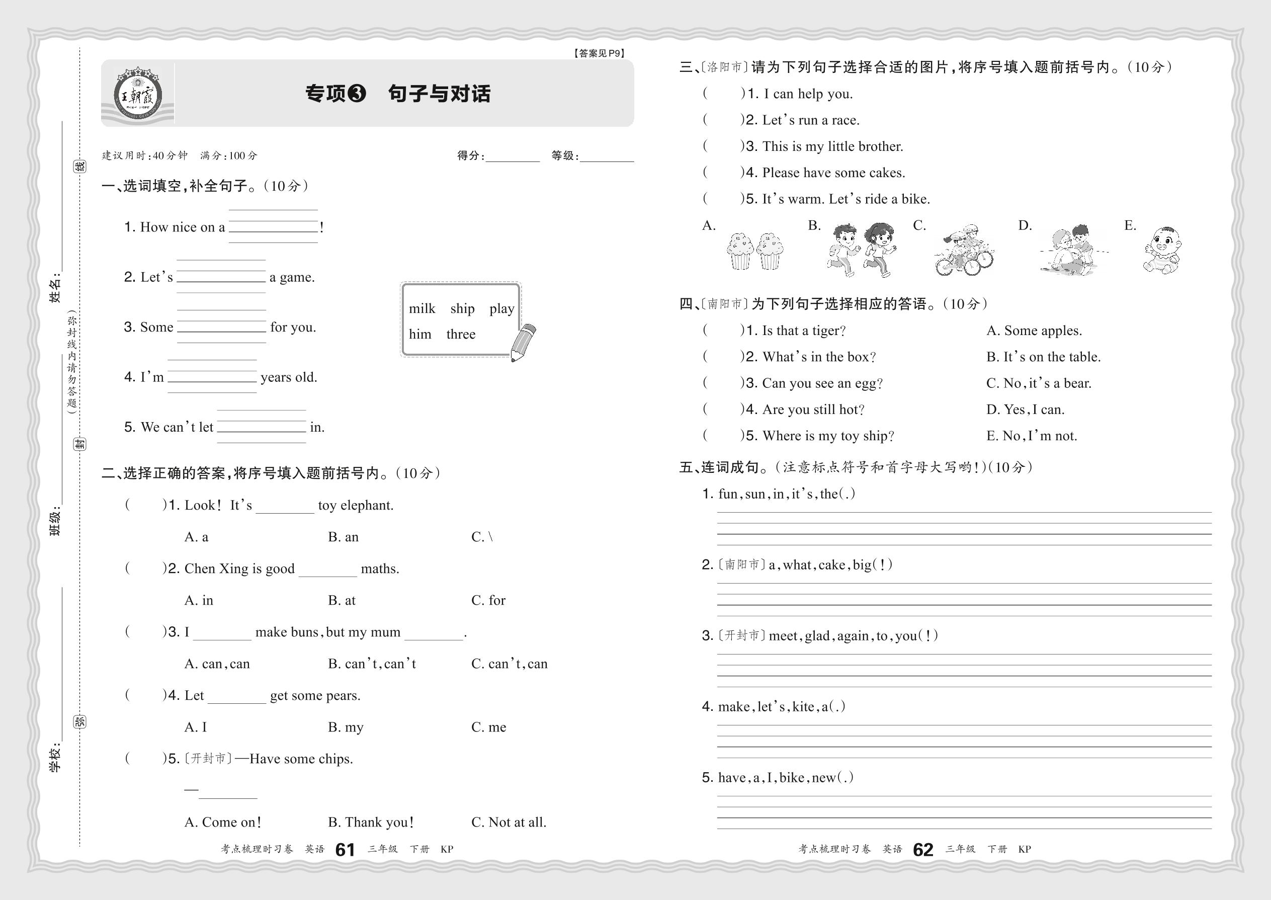 2024春下册三年级英语科普版 期末专项卷KD版·句子与对话【3】