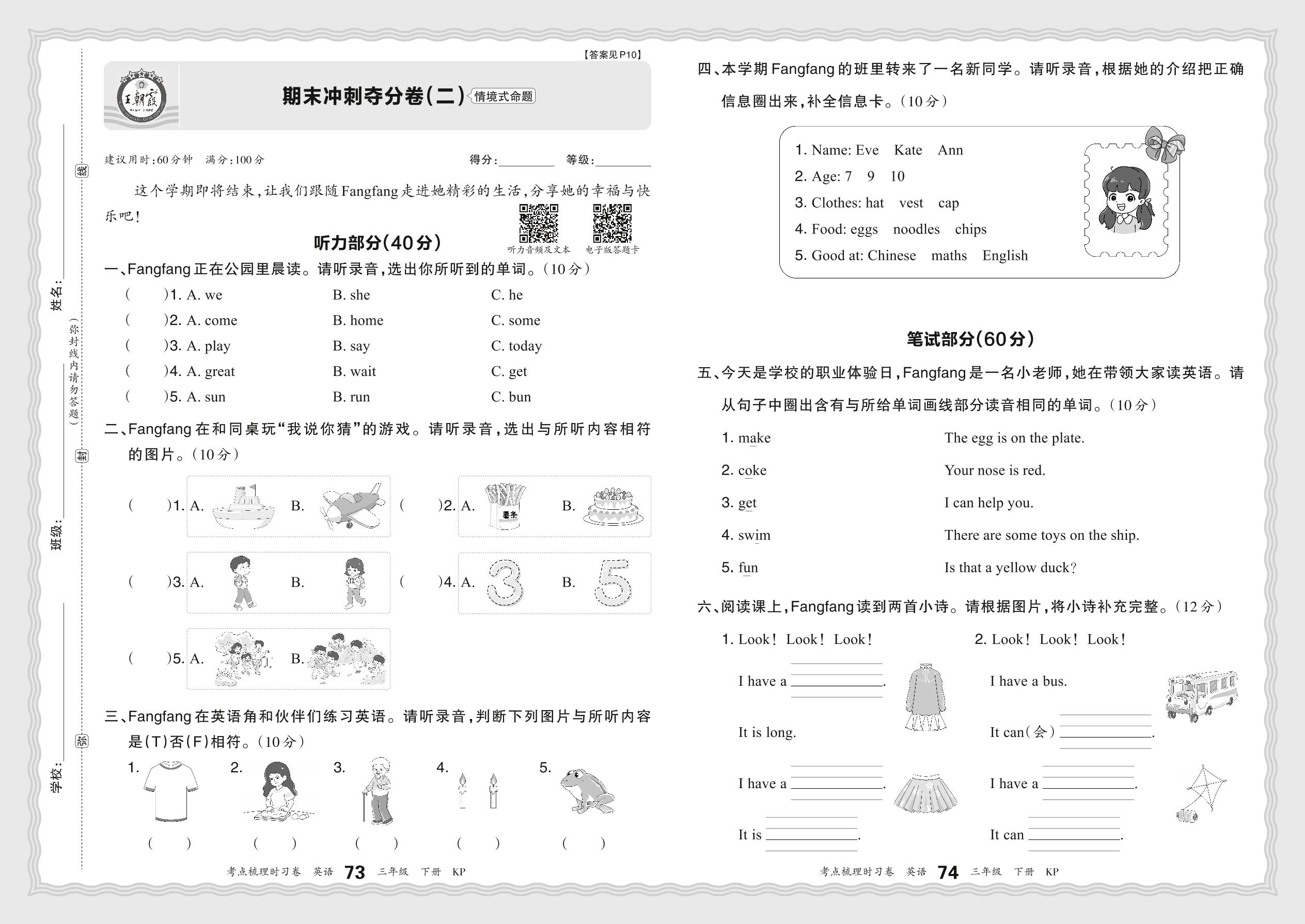 2024春下册三年级英语科普版 期末冲刺夺分卷(二)