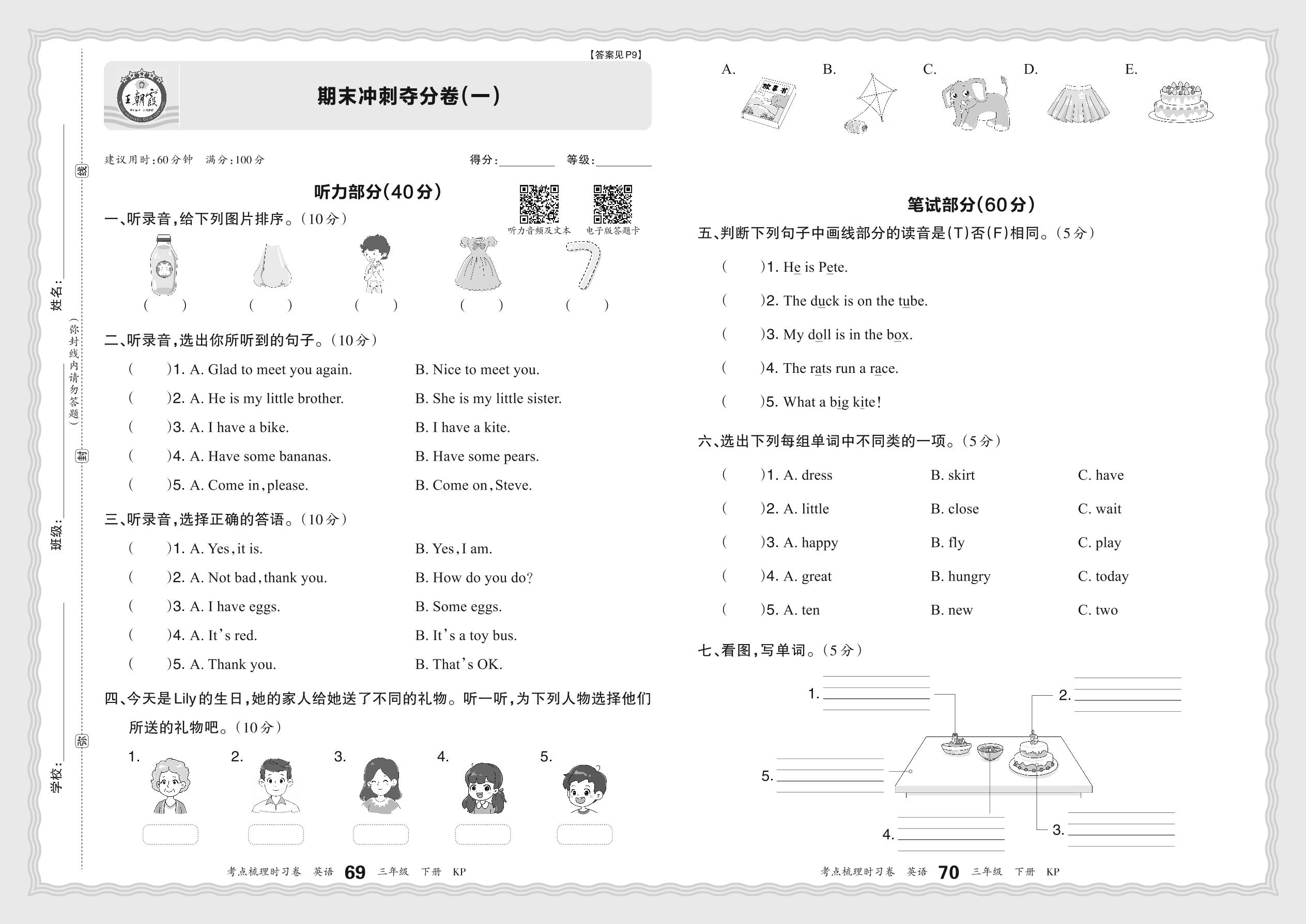 2024春下册三年级英语科普版 期末冲刺夺分卷(一)