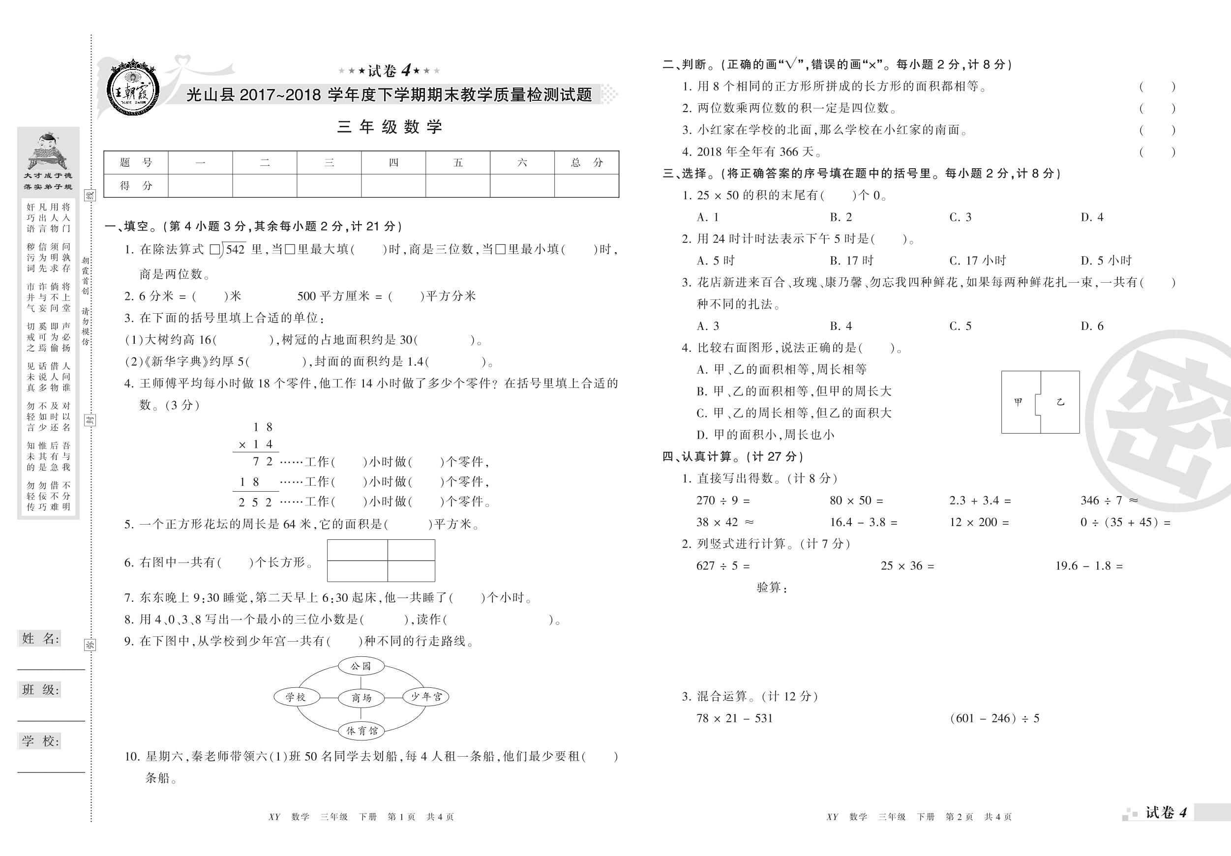 2017-2018学年第二学期信阳市光山县三年级数学试卷(人教版)【4】