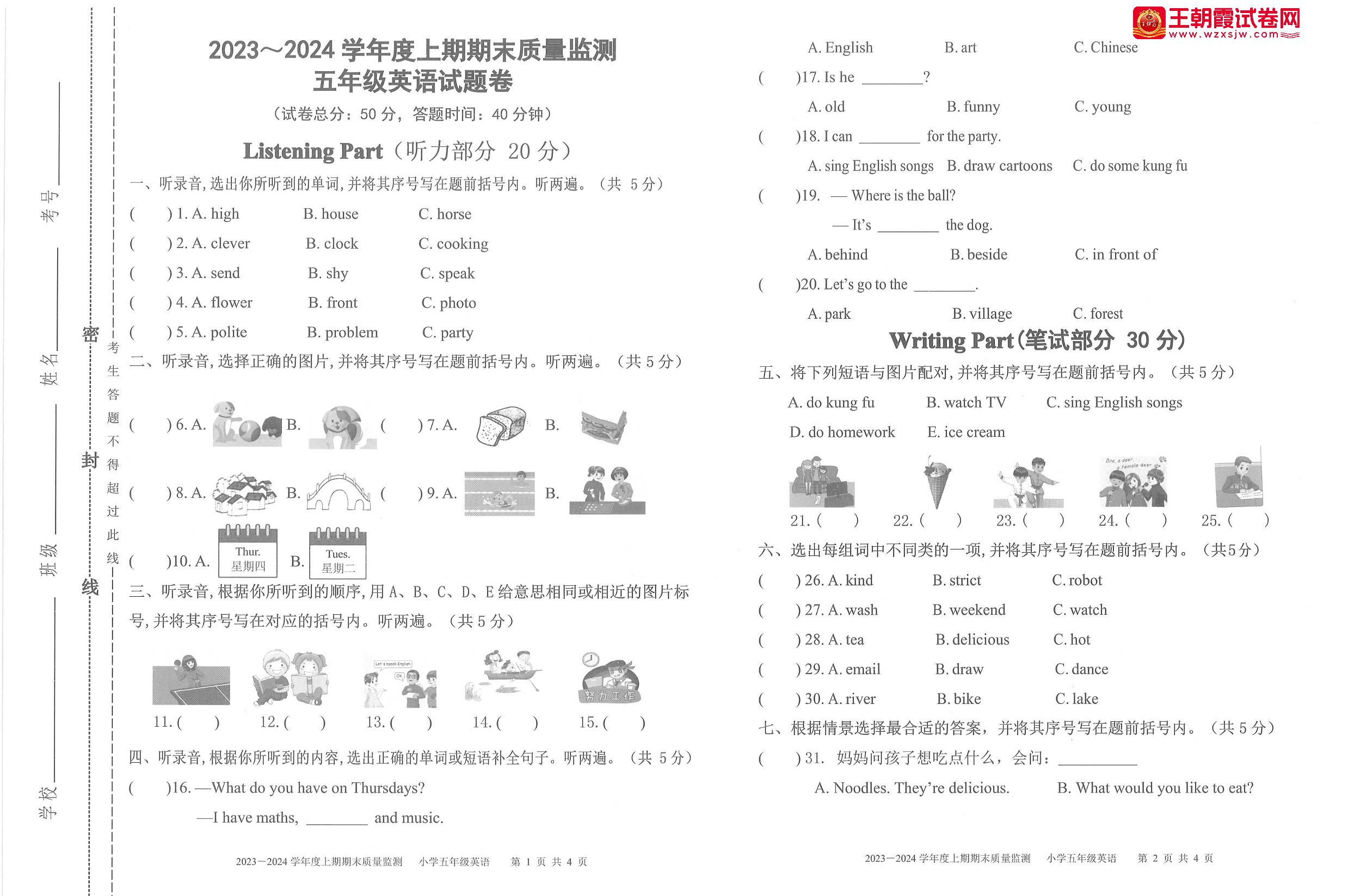 重庆市大足区2023-2024学年度上学期期末质量监测试题卷五年级英语(人教PEP版)【无听力音频】