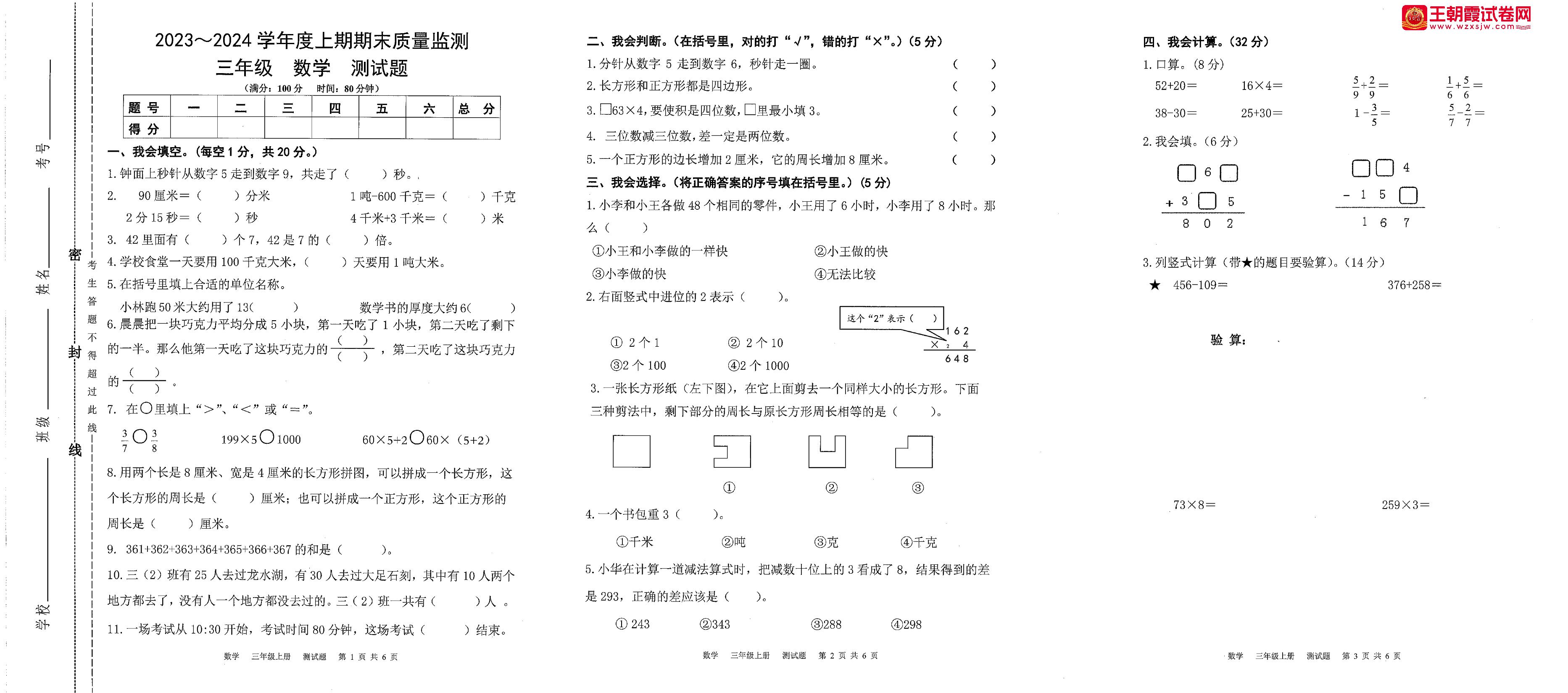 重庆市大足区2023-2024学年度上学期期末质量监测试题卷三年级数学(人教版)