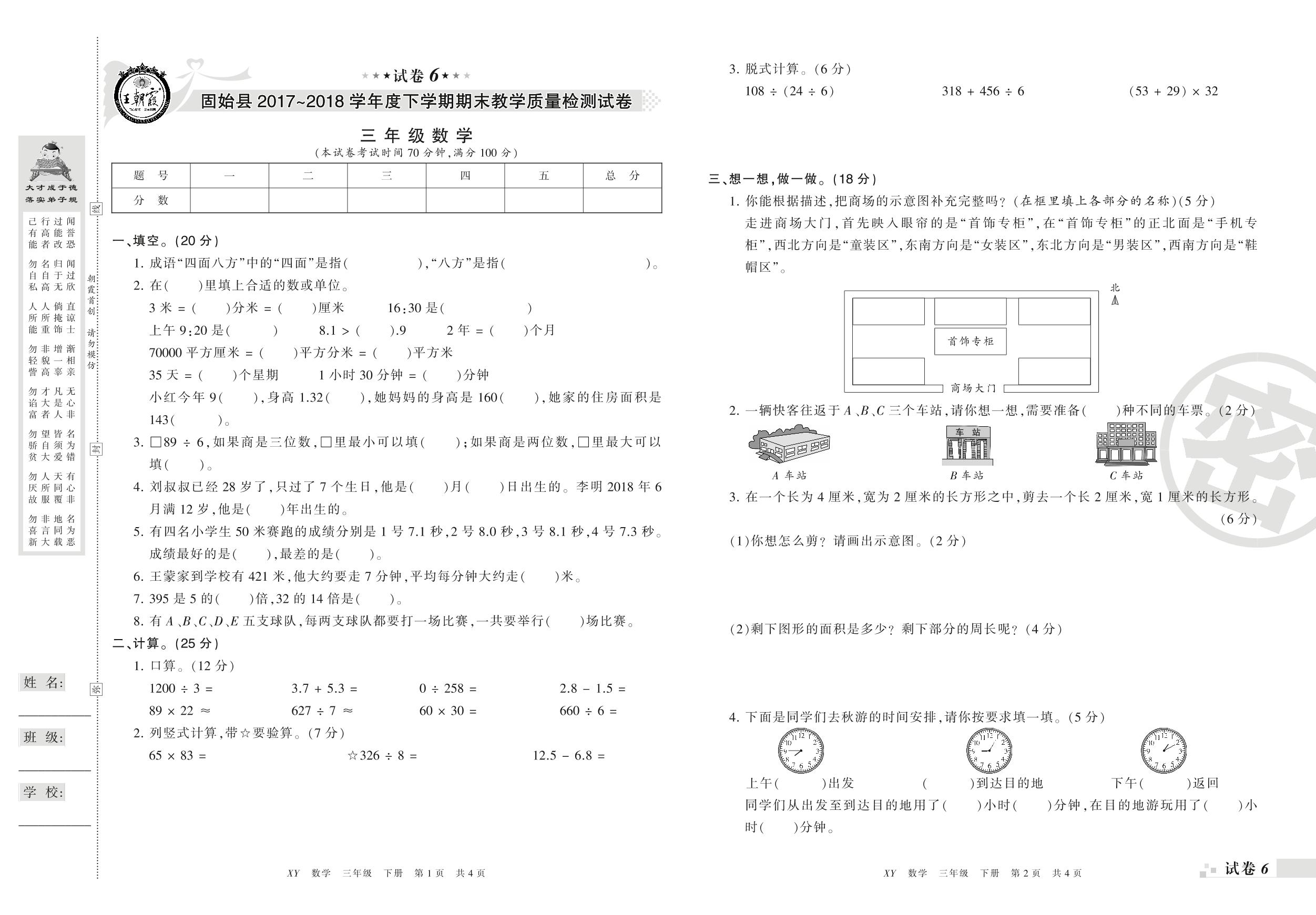 2017-2018学年第二学期信阳市固始县三年级数学试卷(人教版)【6】