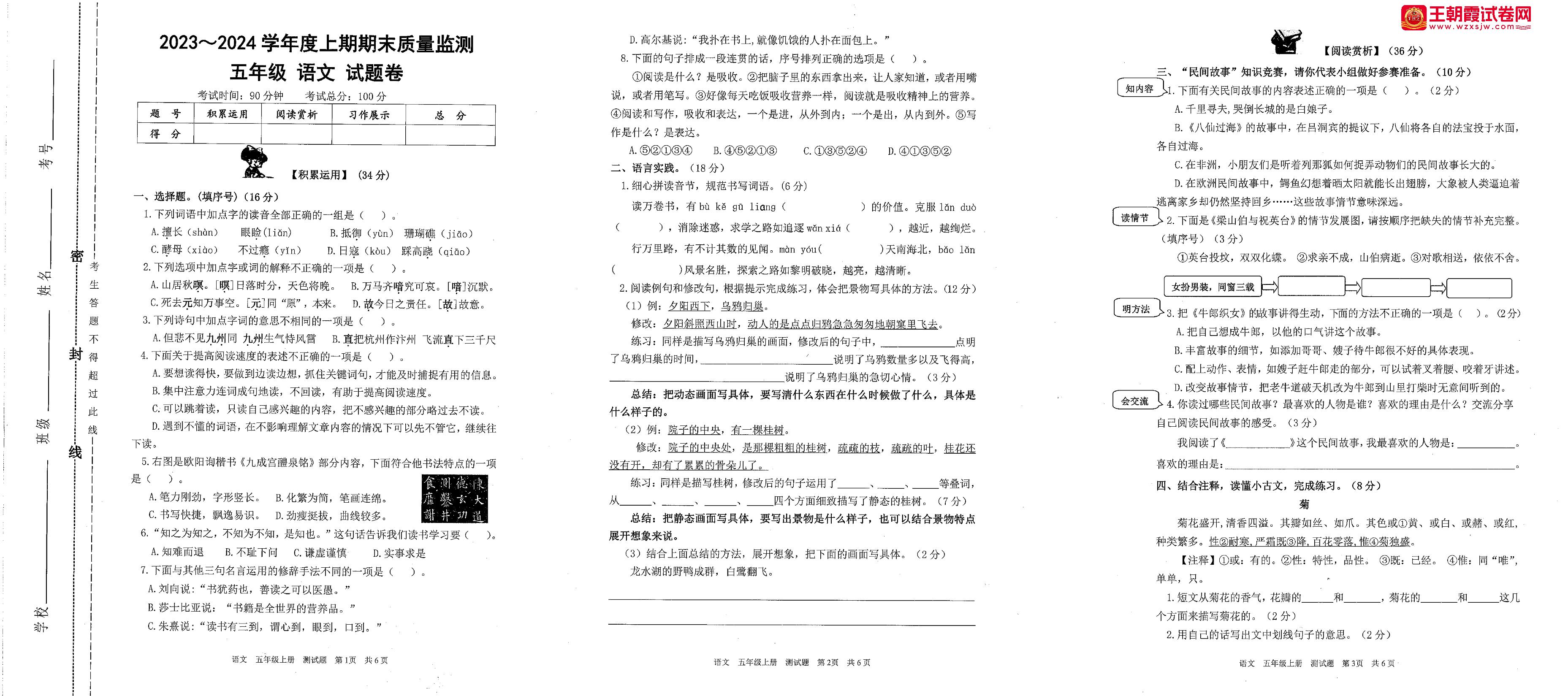 重庆市大足区2023-2024学年度上学期期末质量监测试题卷五年级语文(人教版)