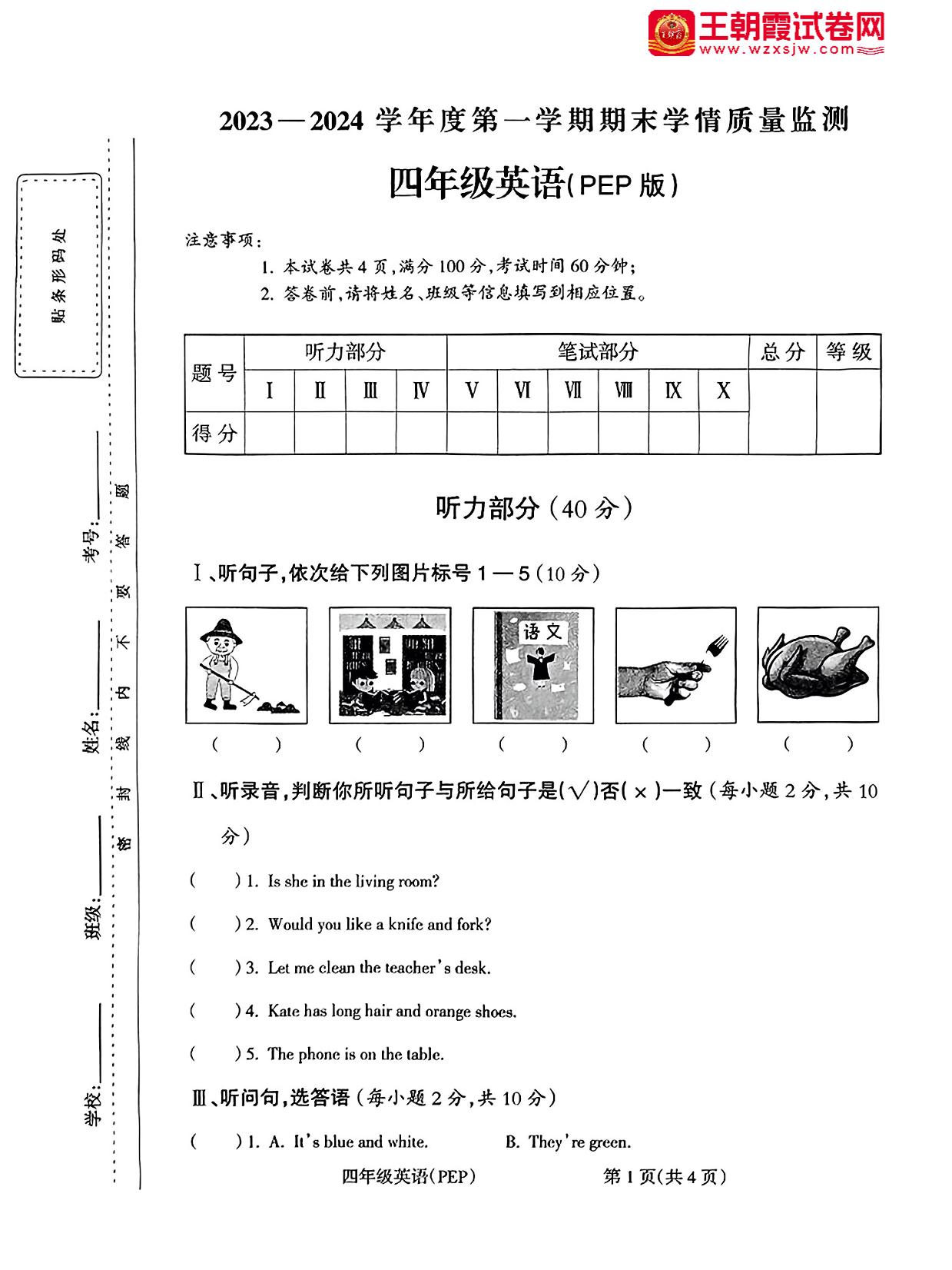 山西省朔州市怀仁市新桥小学2023-2024学年度第一学期期末学情质量监测试卷四年级英语(人教PEP版)【无听力音频】