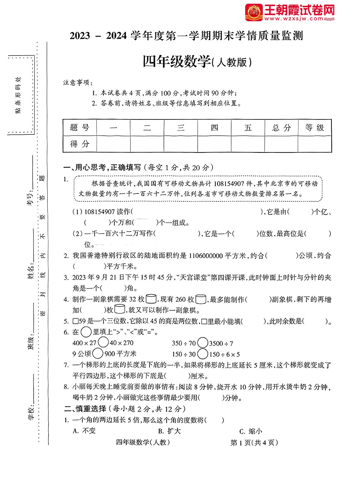 山西省朔州市怀仁市新桥小学2023-2024学年度第一学期期末学情质量监测试卷四年级数学(人教版)