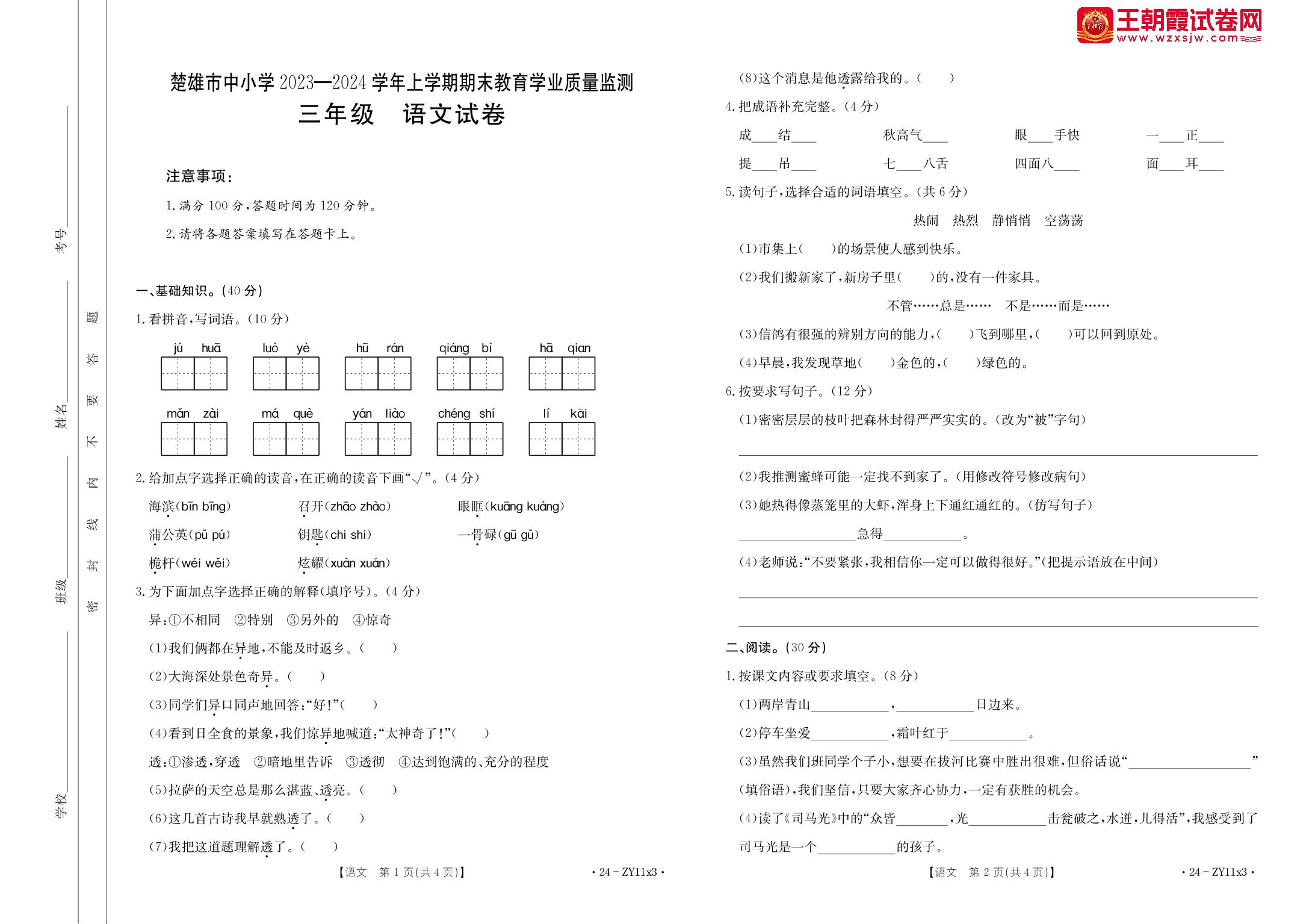 云南省楚雄彝族自治州2023-2024学年上学期期末教育学业质量监测试卷三年级语文(人教版)