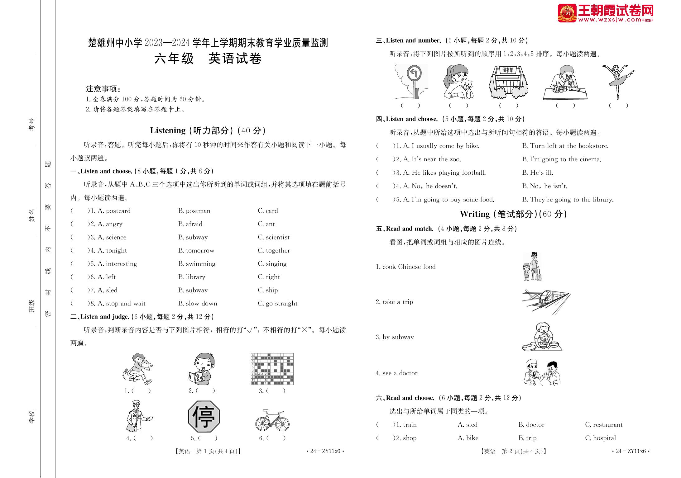 云南省楚雄彝族自治州2023-2024学年上学期期末教育学业质量监测试卷六年级英语(人教PEP版)【无听力音频】