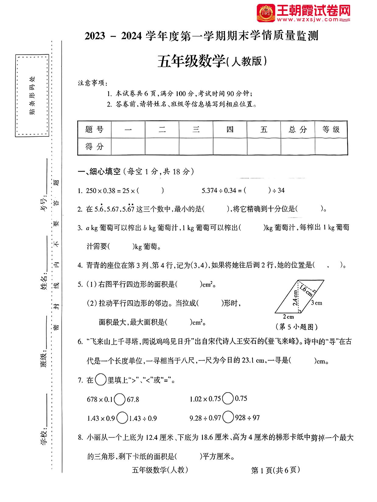 山西省朔州市怀仁市新桥小学2023-2024学年度第一学期期末学情质量监测试卷五年级数学(人教版)