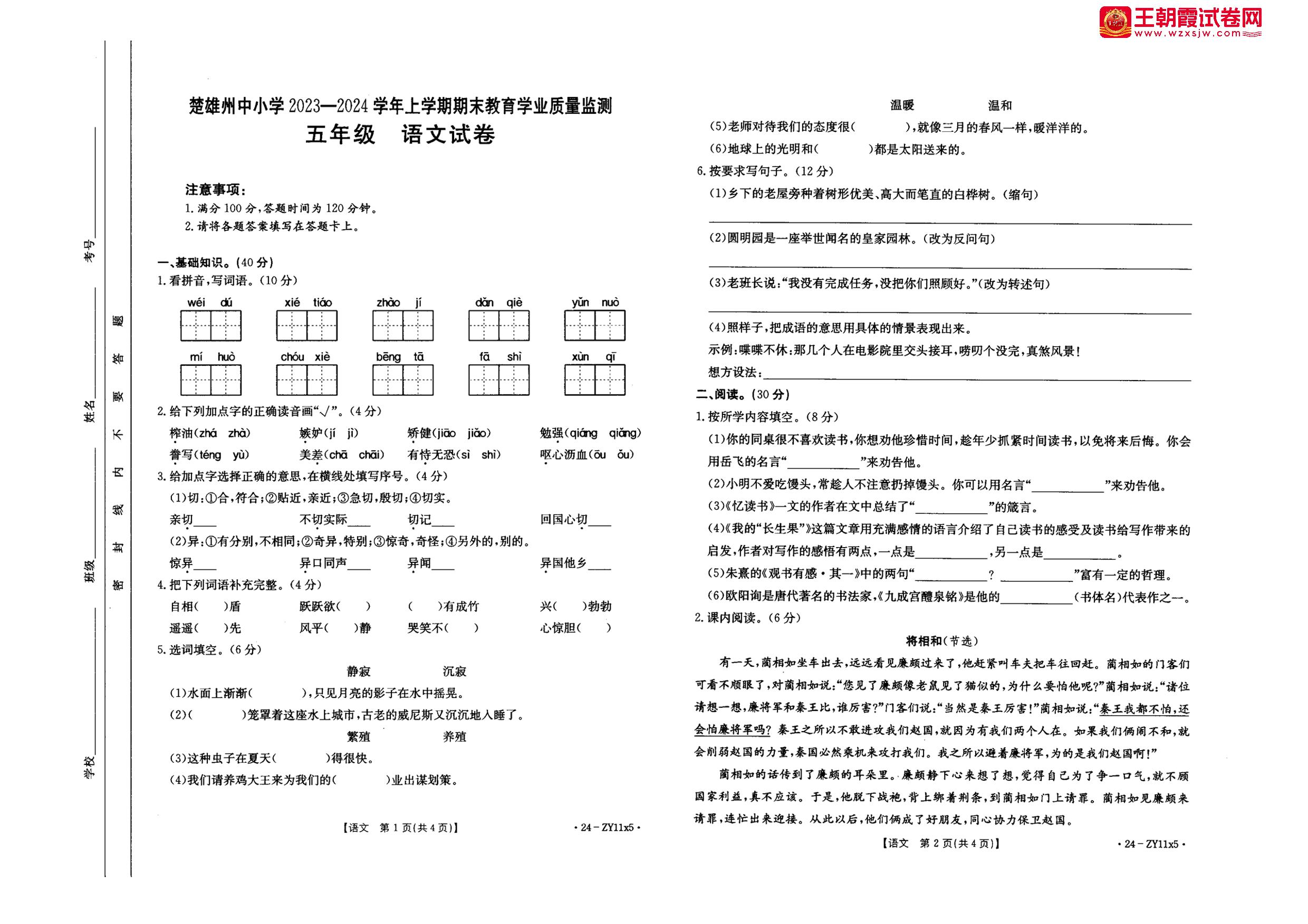 云南省楚雄彝族自治州2023-2024学年上学期期末教育学业质量监测试卷五年级语文(人教版)
