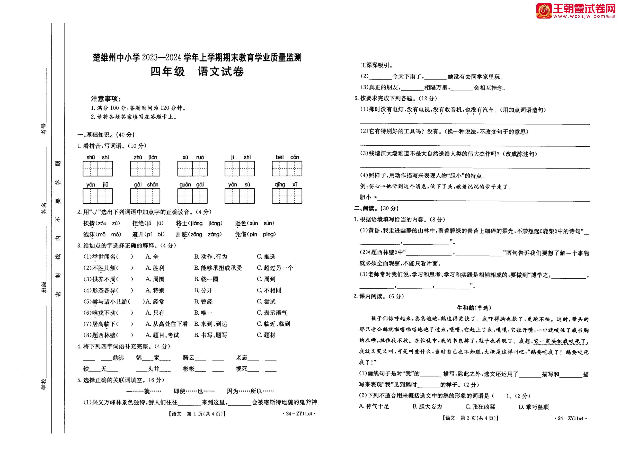云南省楚雄彝族自治州2023-2024学年上学期期末教育学业质量监测试卷四年级语文(人教版)