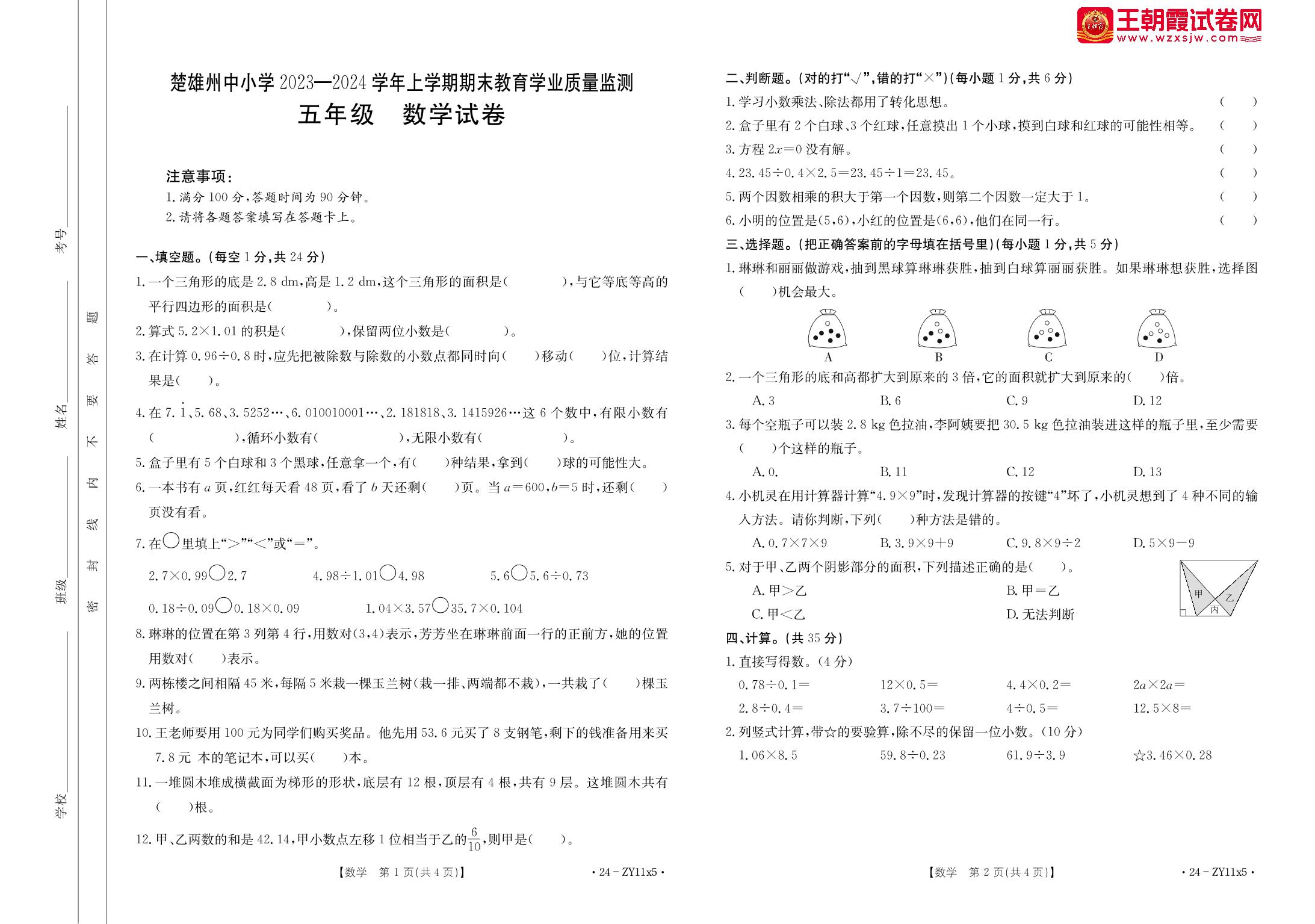 云南省楚雄彝族自治州2023-2024学年上学期期末教育学业质量监测试卷五年级数学(人教版)
