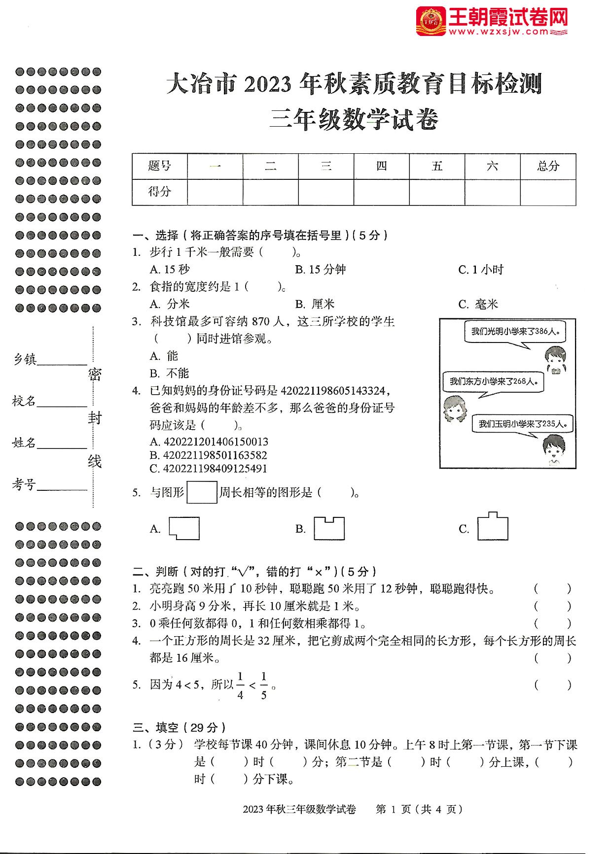 湖北省黄石市大冶市2023年秋素质教育目标检测试卷三年级数学(人教版)
