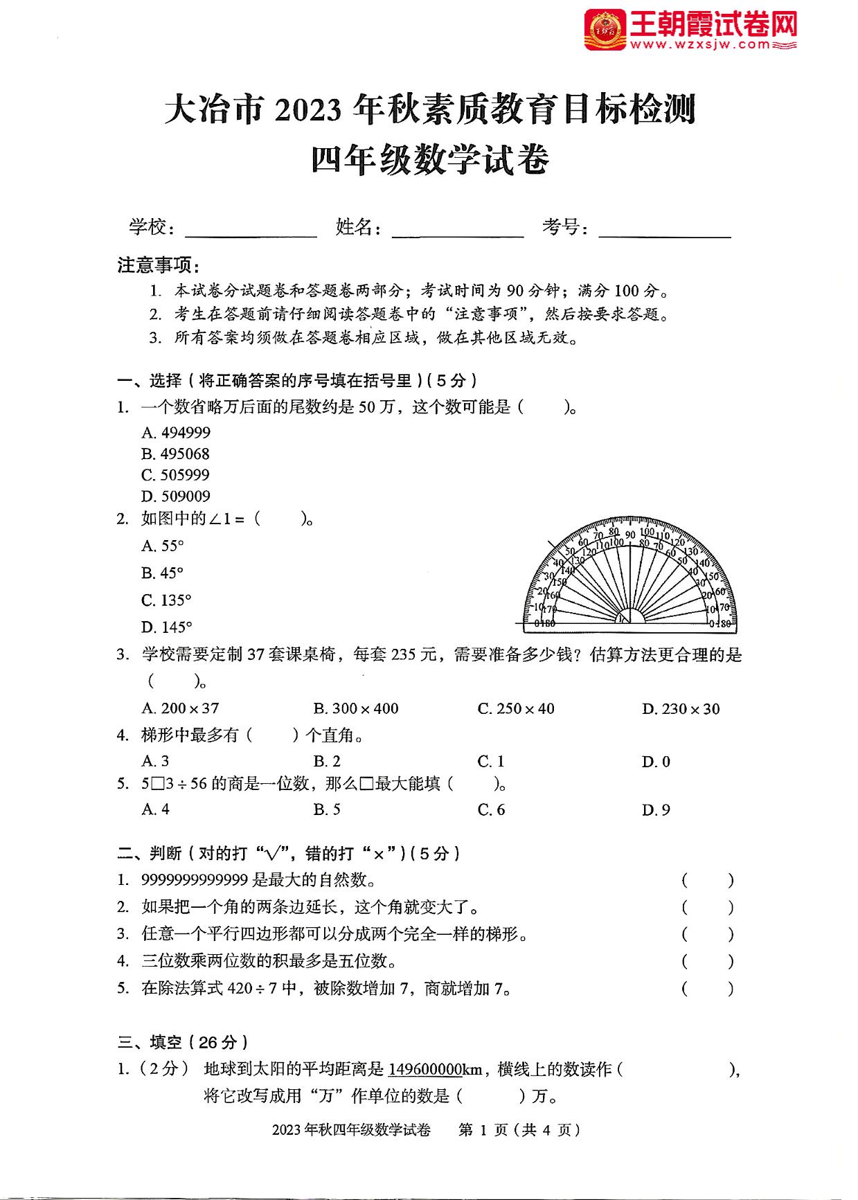 湖北省黄石市大冶市2023年秋素质教育目标检测试卷四年级数学(人教版)