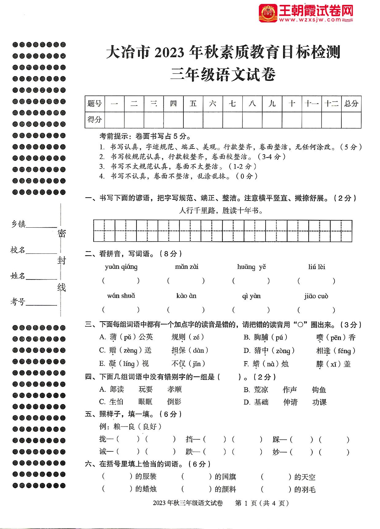 湖北省黄石市大冶市2023年秋素质教育目标检测试卷三年级语文(人教版)