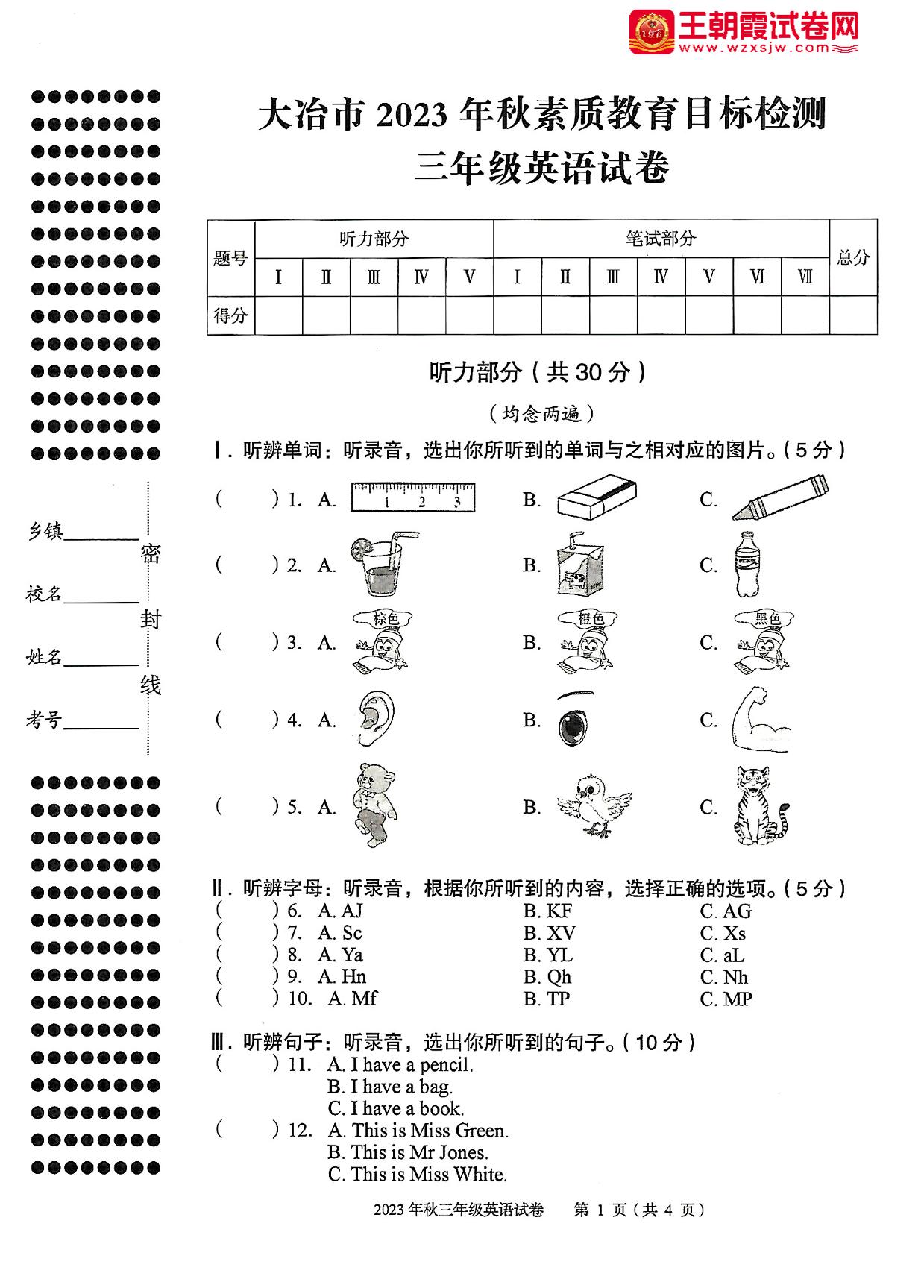 湖北省黄石市大冶市2023年秋素质教育目标检测试卷三年级英语(人教PEP版)【无听力音频】