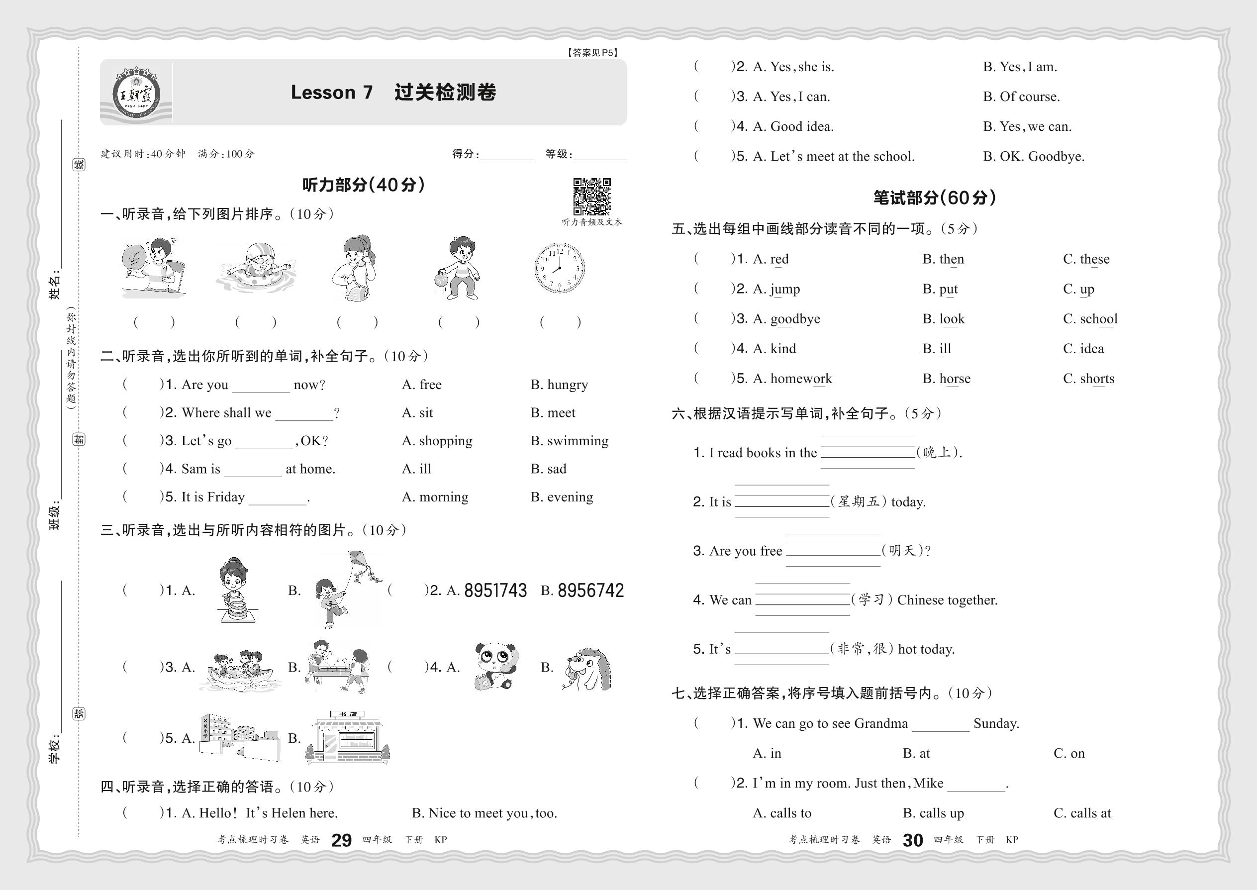2024春下册四年级英语科普版 Lesson 7 过关检测卷