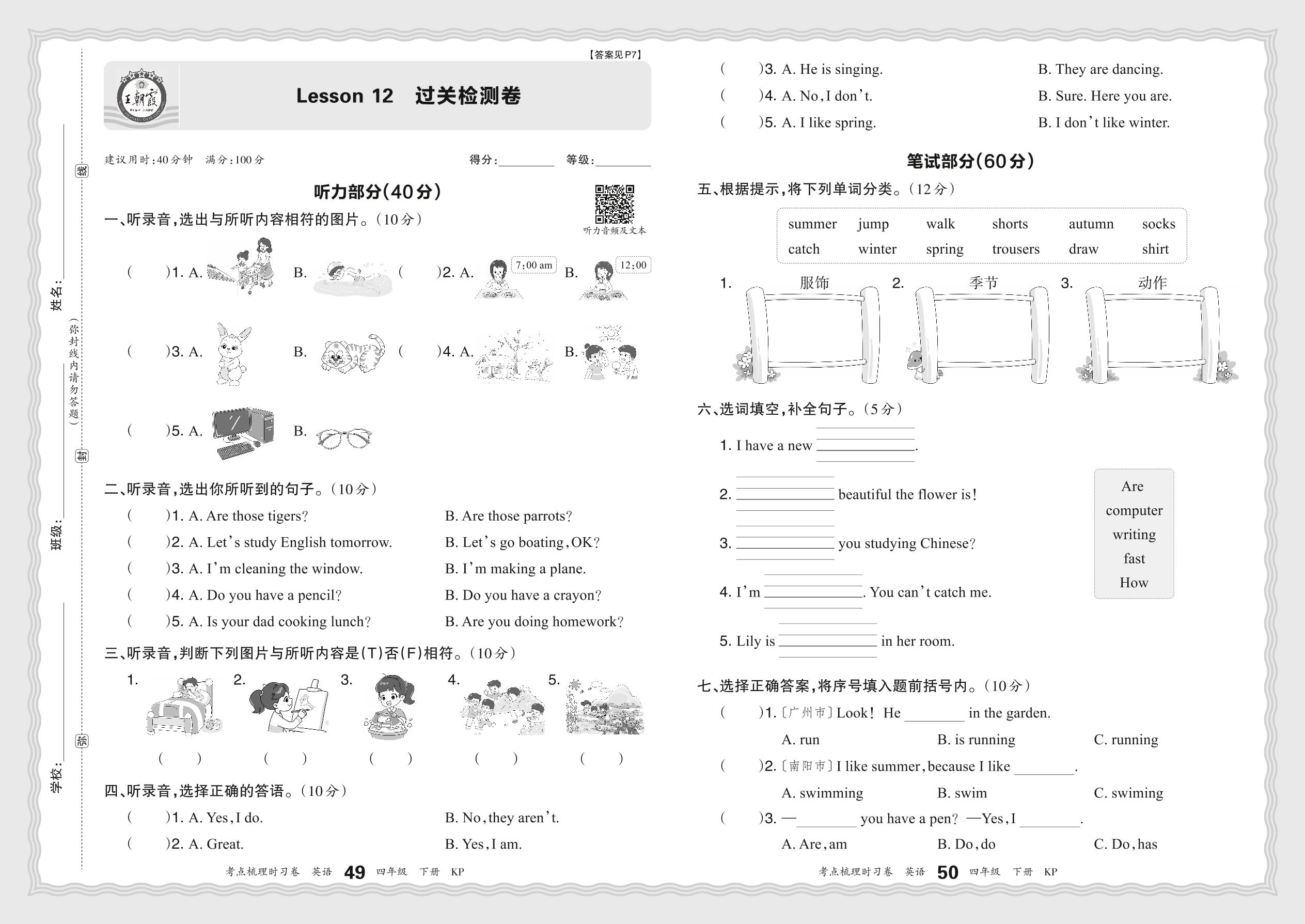 2024春下册四年级英语科普版 Lesson 12 过关检测卷