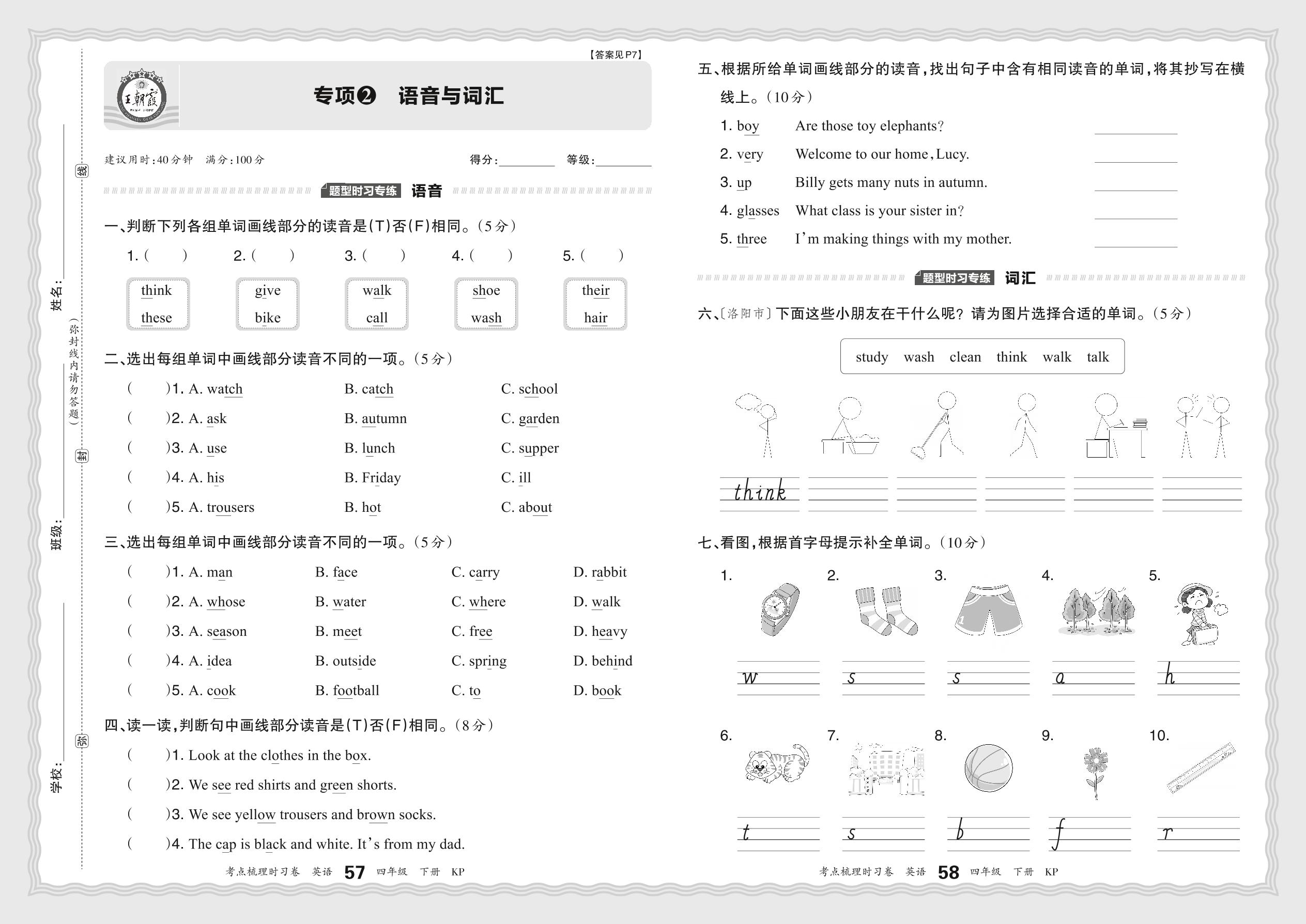 2024春下册四年级英语科普版 期末专项卷KD版·语音与词汇【2】