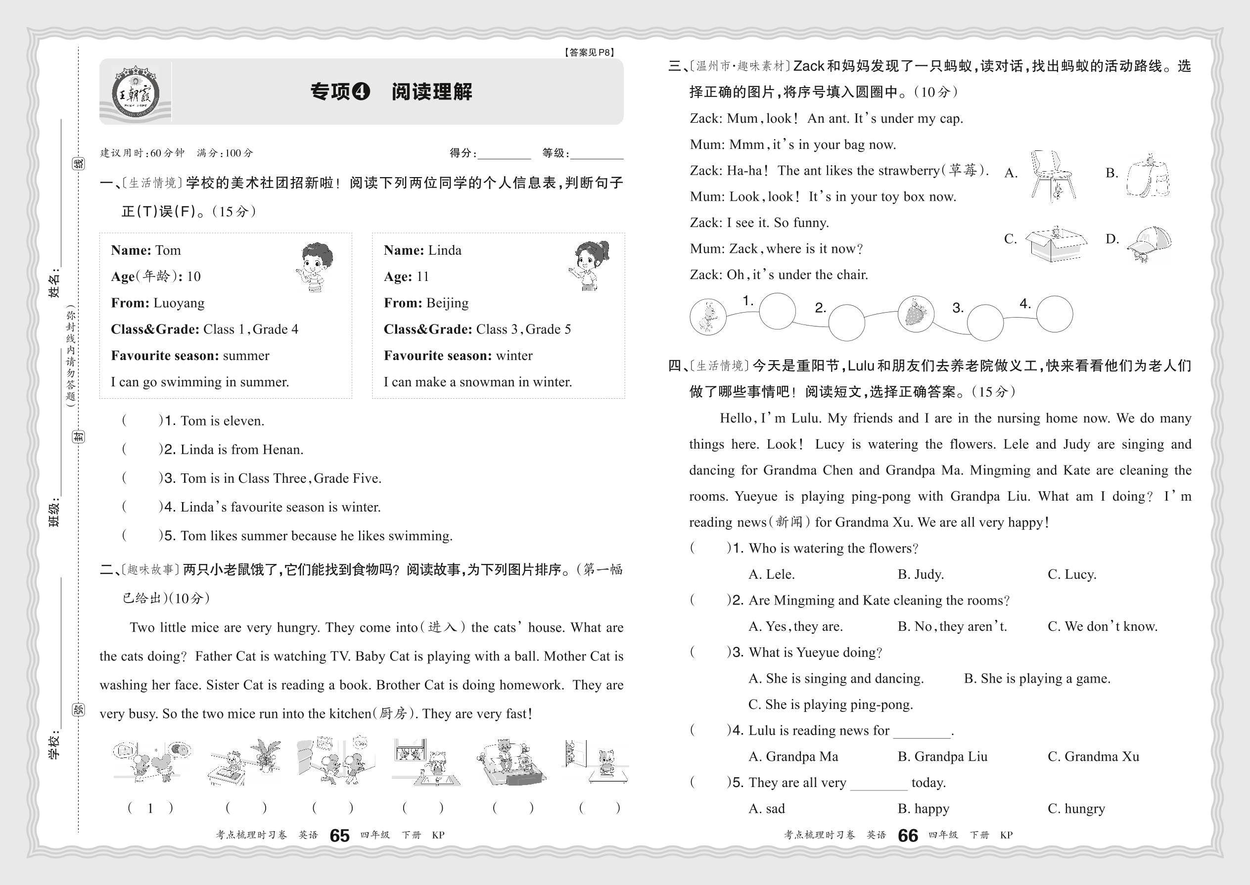 2024春下册四年级英语科普版 期末专项卷KD版·阅读理解【4】