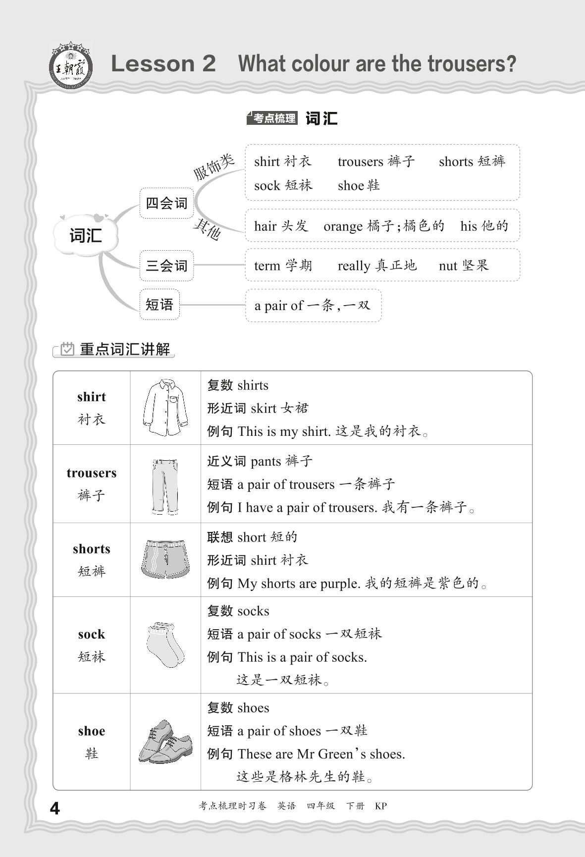 2024春下册四年级英语科普版 考点梳理手册——Lesson 2 What colour are the trousers?