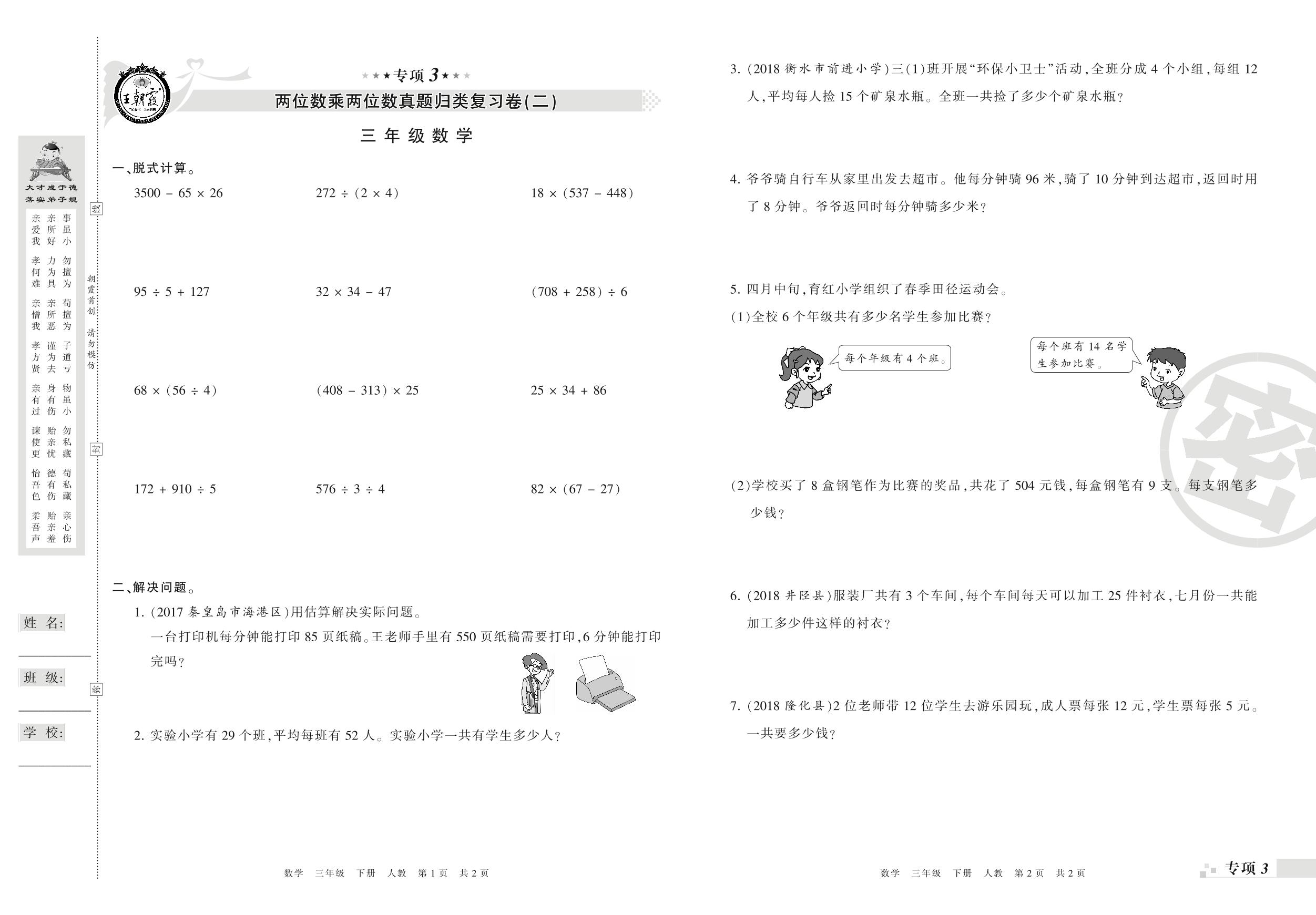王朝霞期末专项卷——两位数乘两位数(二)、面积(一)真题归类复习卷三年级下册数学(人教版)_R210804100158【0】